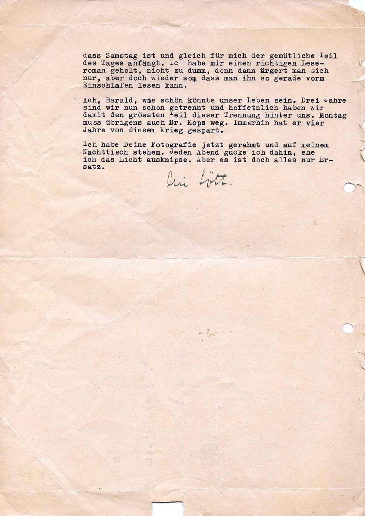 Ach Harald, wie schön könnte unser Leben sein. Drei Jahre sind wir nun schon getrennt und hoffentlich haben wir damit den größten Teil der Trennung hinter uns. Montag muss übrigens auch Dr. Kops weg. Immerhin hat er vier Jahre von diesem Krieg gespart. - Ich habe Deine Fotografie jetzt gerahmt auf meinem Nachttisch stehen. Jeden Abend gucke ich dahin, ehe ich das Licht ausknipse, aber es ist alles doch nur Ersatz,