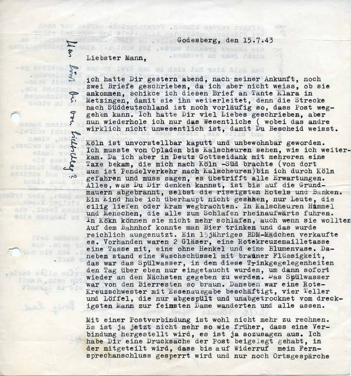 Köln ist unvorstellbar kaputt und unbewohnbar geworden. Ich musste von Opladen bis Kalscheuren sehen, wie ich weiterkam. Da ich aber in Köln-Deutz Gottseidank mit mehreren eine Taxe bekam, die mich nach Köln-Süd brachte, bin ich durch Köln gefahren und muss sagen, es übertrifft alle Erwartungen. Alles, was Du Dir denken kannst, ist bis auf die Grundmauern abgebrannt, selbst die riesigsten Hotels und Banken. Ein Kind habe ich überhaupt nicht gesehen, nur Leute, die eilig liefen oder Kram wegbrachten. In Kalscheuren Himmel und Menschen, die alle zum Schlafen rheinaufwärts fuhren. In Köln können die nicht mehr schlafen, auch wenn sie wollten.
