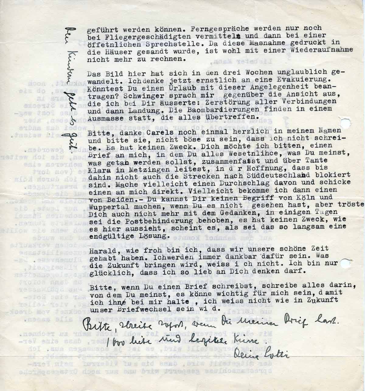 Bitte, danke Carels noch einmal herzlich in meinen Namen und bitte sie, nicht böse zu sein, dass ich nicht schreibe. Es hat keinen Zweck. Dich möchte ich bitten, einen Brief an mich, in dem Du alles Wesentliche, was Du meinst, was getan werden soll, zusammenfasst und an Tante Klara in Metzingen leitest, in der Hoffnung, dass bis dahin nicht auch die Strecken nach Süddeutschland blockiert sind. Mache vielleicht einen Durchschlag davon und schicke einen an mich direkt. Vielleicht bekommte ich dann einen von Beiden.