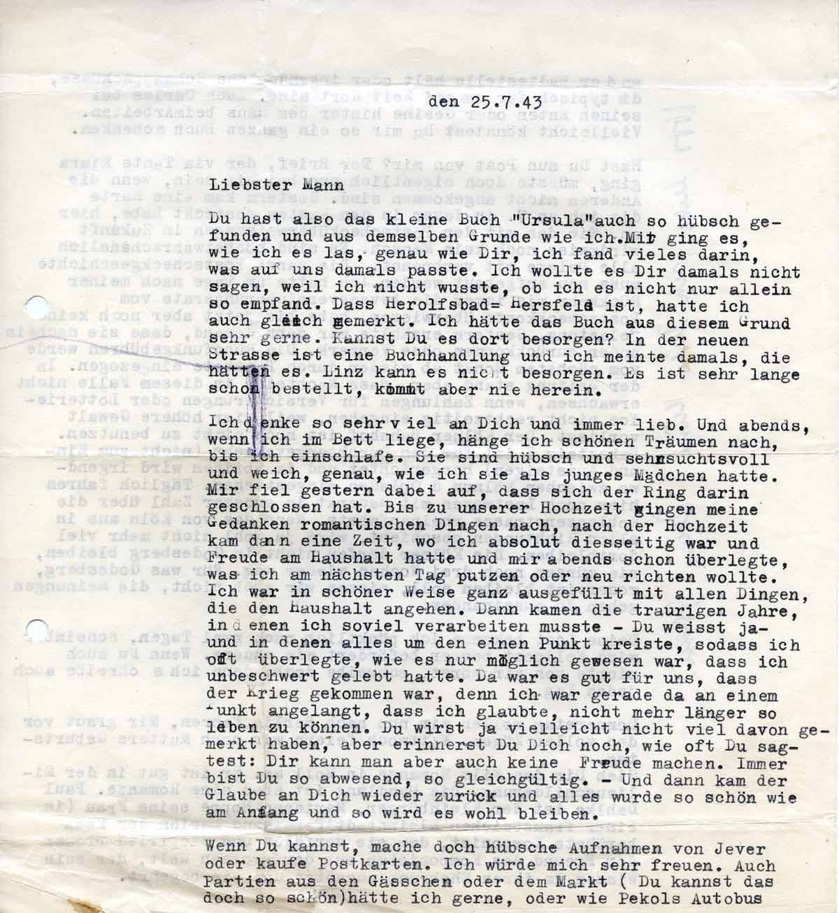 Du hast also das kleine Buch ´Ursula´ auch so hübsch gefunden und aus demselben Grund wie ich. Mir ging es wie Dir, ich fand vieles darin, was auf uns damals passte. Ich wollte es Dir damals nicht sagen, weil ich nicht wusste, ob ich allein so empfand, Dass Herolfsbad gleich Hersfeld ist, hatte ich auch gleich gemerkt. Ich hätte das Buch aus diesem Grunde sehr gerne. Kannst Du es dort besorgen? In der neuen Straße ist eine Buchhandlung, und ich meinte damals, die hätten es. Linz kann es nicht besorgen. Es ist sehr lange schon bestellt, kommt aber nie herein.