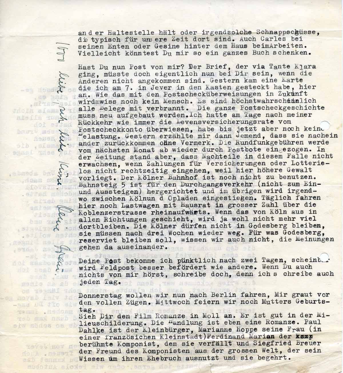 Hast Du nun Post von mir? Der Brief, der via Tante Klara ging, müsste doch eigentlich nun bei Dir sein, wenn die anderen nicht angekommen sind. Gestern kam eine Karte, die ich am 1. in Jever in den Kasten gesteckt hatte, hier an. Wie das mit den Postschecküberweisungen in Zukunft wird, weiß kein Mensch. Es sind höchstwahrscheinlich alle Belege mit verbrannt. Die ganze Postscheckgeschichte muss neu aufgebaut werden. Ich hatte am Tage meiner Rückkehr wie immer die Lebensversicherungsrate vom Postscheckkonto überwiesen, habe aber bis jetzt noch keine Belastung.