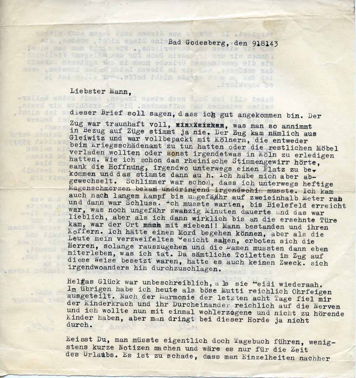 Dieser Brief soll sagen, dass ich gut angekommen bin. Der Zug war traumhaft voll. Was man so annimmt in Bezug auf Züge stimmt nie. Der Zug kam nämlich aus Gleiwitz und war vollgepackt mit Kölnern, die entweder beim Kriegsschädenamt zu tun hatten oder die restlichen Möbel verladen wollten oder sonst irgend etwas in Köln zu erledigen hatten. Wie ich schon das rheinische Stimmengewirr hörte, sank die Hoffnung, irgendwo unterwegs einen Platz zu bekommen, und das stimmte dann auch. Ich habe mich aber abgewechselt. Schlimmer war schon, dass ich unterwegs heftige Magenschmerzen bekam und irgendwo hinmusste. Ich kam auch nach heftigem Kampf bis ungefähr auf zweieinhalb Meter ran, und dann war Schluss. Ich musste warten, bis Bielefeld erreicht war, was noch ungefähr zwanzig Minuten dauerte, aber als ich dann wirklich an die ersehnte Türe kam, war der Ort mit sieben!!! Mann bestanden und ihren Koffern.