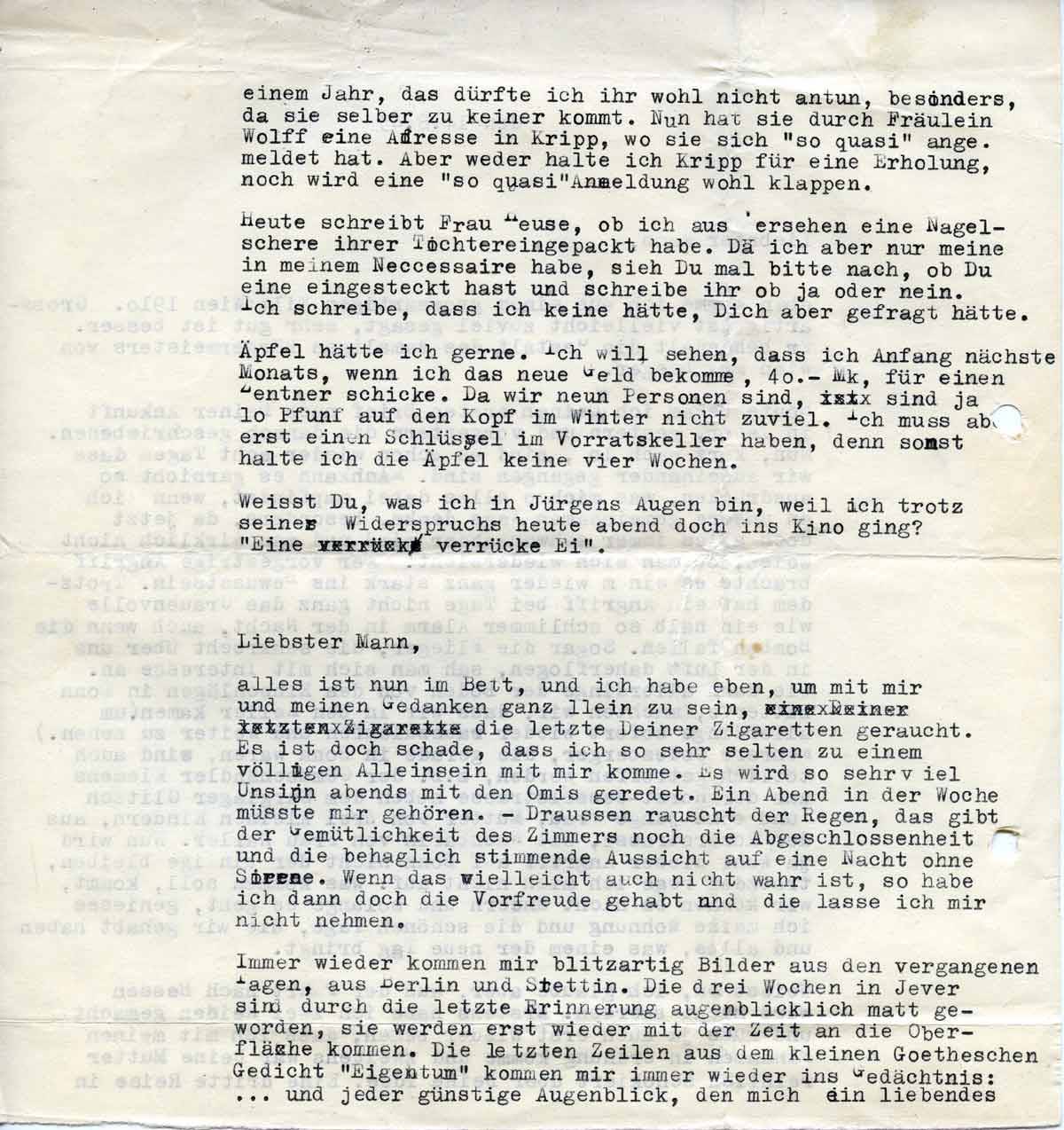 Heute bekam ich Deinen ersten Brief nach Deiner Ankunft in Jever, gestern und vorgestern die danach geschriebenen. Nun, kurz nach 10, sind es schon wieder acht Tage, dass wir auseinandergegangen sind. Man kann es gar nicht so ausdrücken, was ich so alles dabei empfinde, wenn ich an unsere gemeinsamen Tage denke, besonders, da jetzt doch alles immer schwankender wird und man wirklich nicht weiß, ob man sich wiedersieht.