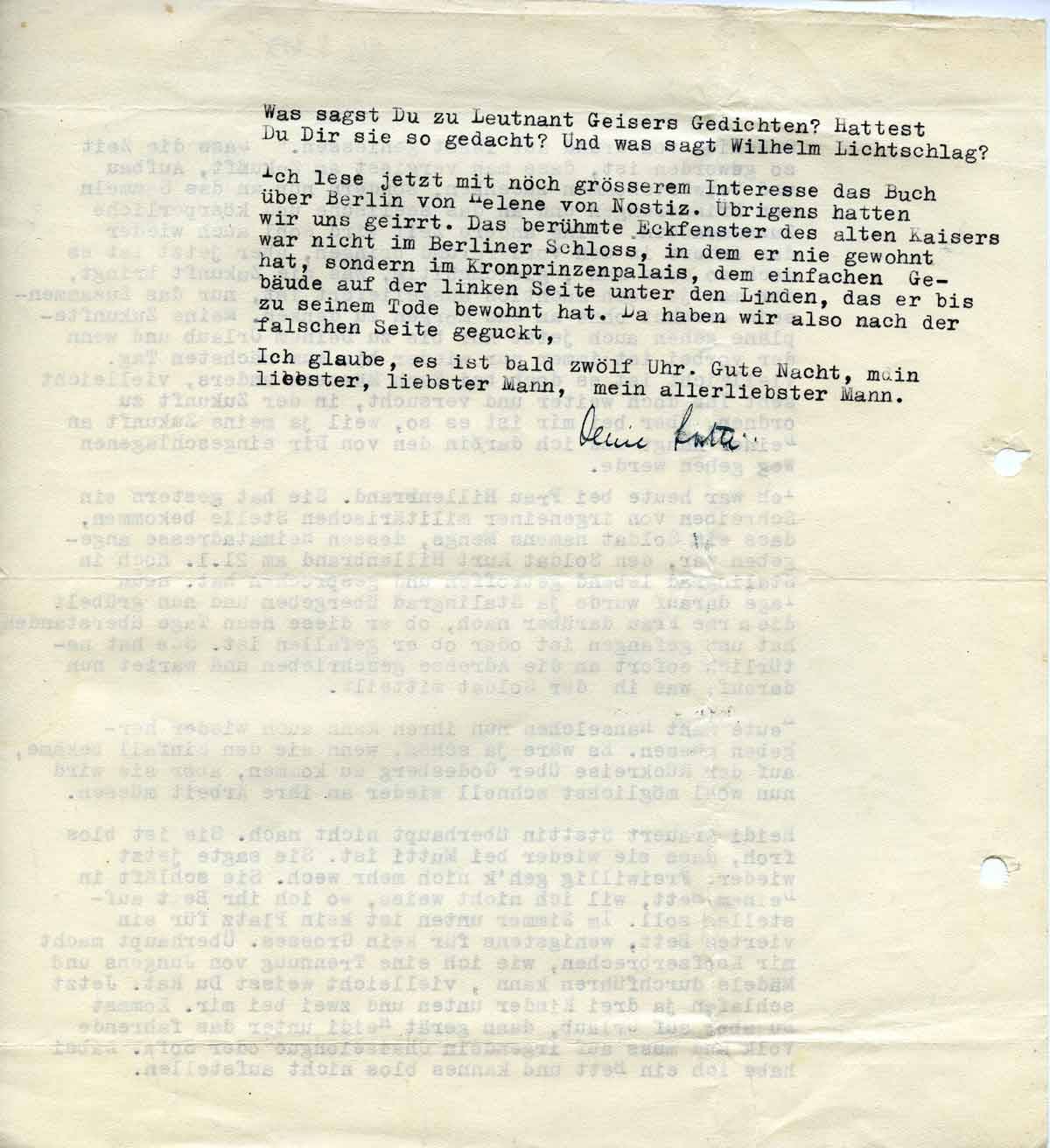 Geschick von Grund auf lässt genießen‘. Dass die Zeit so geworden ist, dass man vergisst, an Zukunft, Aufbau und Vorwärtskommen zu denken, sondern nur an das Sammeln von Erinnerungen. Eine andere Zeit wird wohl auch wieder das andere in den Vordergrund treten lassen, aber jetzt ist es doch so, dass man, gleichgültig, was die Zukunft bringt, der man ja machtlos ausgeliefert ist, nur das Zusammensein ersehnt, ohne an das Morgen zu denken. Meine Zukunftspläne gehen auch jetzt nur bis zu Deinem Urlaub und wenn der vorbei ist, immer nur bis zum nächsten Tag. Vielleicht ist es doch bei Euch Männern anders, vielleicht sehr Ihr doch weiter und versucht, in der Zukunft zu ordnen, aber bei mir ist es so, weil ja meine Zukunft an Deiner hängt und ich darin den von Dir eingeschlagenen Weg gehen werde.