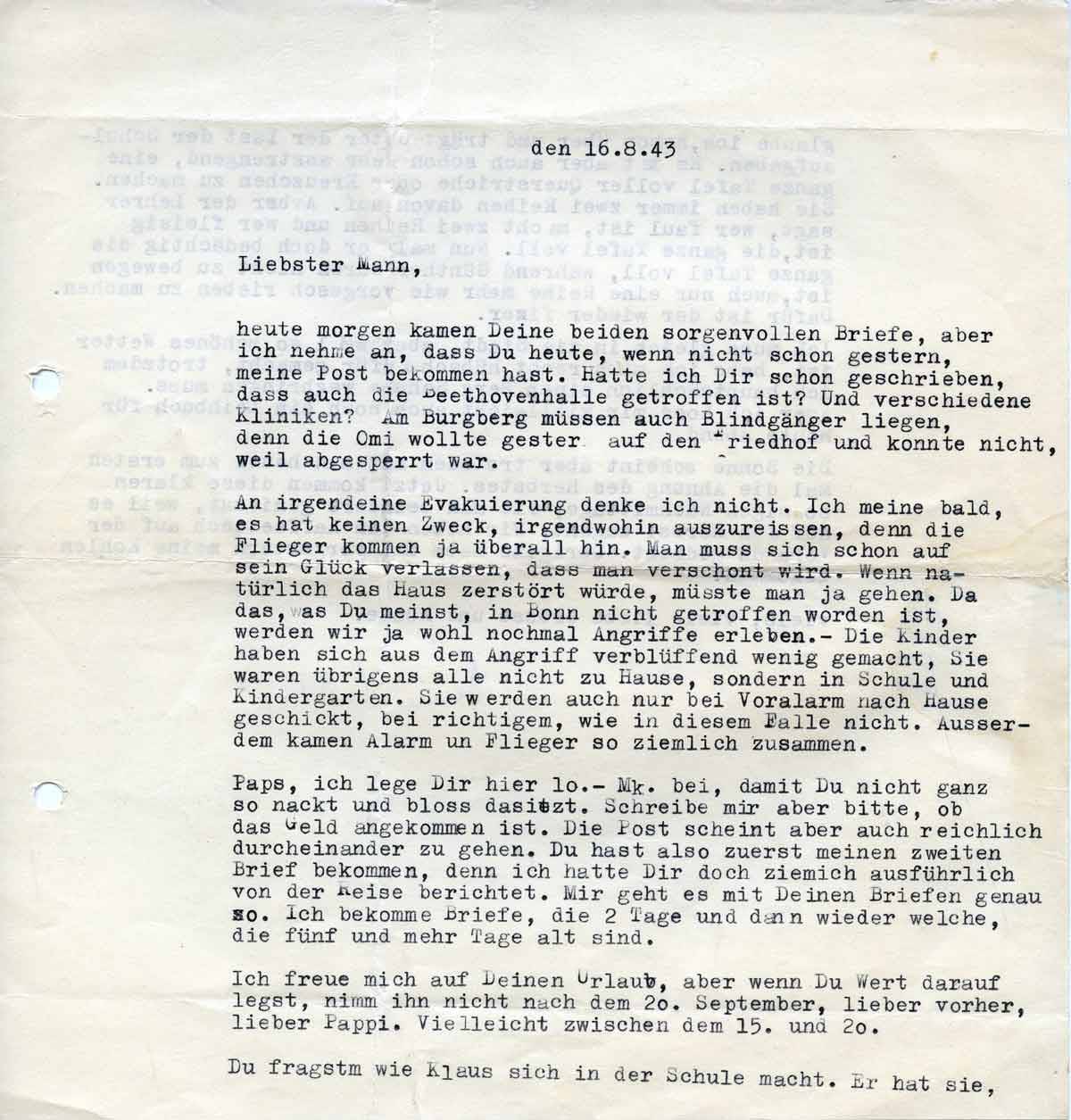 Heute morgen kamen Deine beiden sorgenvollen Briefe, aber ich nehme an, daß Du heute, wenn nicht schon gestern, meine Post bekommen hast. Hatte ich Dir schon geschrieben, dass auch die Beethovenhalle betroffen ist? Und verschiedene Kliniken? Am Burgberg müssen auch Blindgänger liegen, denn die Omi wollte gestern auf den Friedhof und konnte nicht, weil abgesperrt.