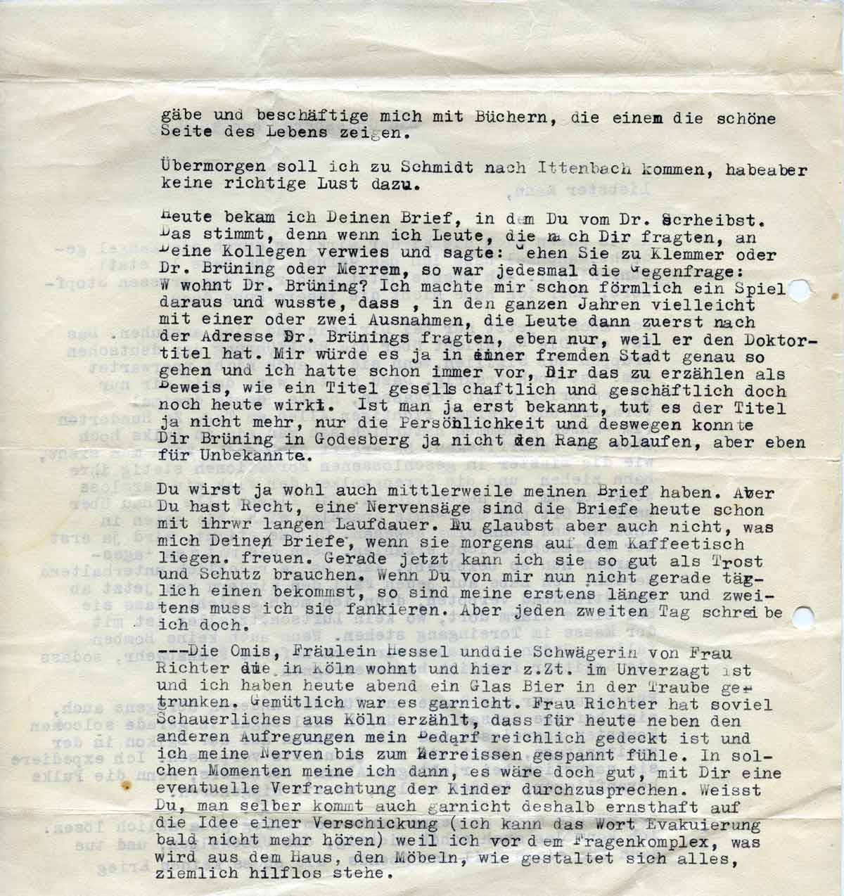 Heute bekam ich Deinen Brief, in dem Du vom Dr. Schreibst. Das stimmt, denn wenn ich Leute, die nach Dir fragten, an Deine Kollegen verwies und sagte: Gehen Sie zu Klemmer oder Dr. Brüning oder Merrem, so war jedes Mal die Gegenfrage: Wo wohnt Dr. Brüning? Ich machte mir schon förmlich ein Spiel daraus und wusste, dass, in den ganzen Jahren vielleicht mit einer oder zwei Ausnahmen, die Leute dann zuerst nach der Adresse Dr. Brünings fragten, eben nur, weil er den Doktortitel hat. Mir würde es ja in einer fremden Stadt genau so gehen und ich hatte schon immer vor, Dir das zu erzählen als Beweis, wie ein Titel gesellschaftlich und geschäftlich doch noch heute wirkt. Ist man ja erst bekannt, tut es der Titel ja nicht mehr, nur die Persönlichkeit und deswegen konnte Dir Brüning in Godesberg ja nicht den Rang ablaufen, aber eben für Unbekannte.