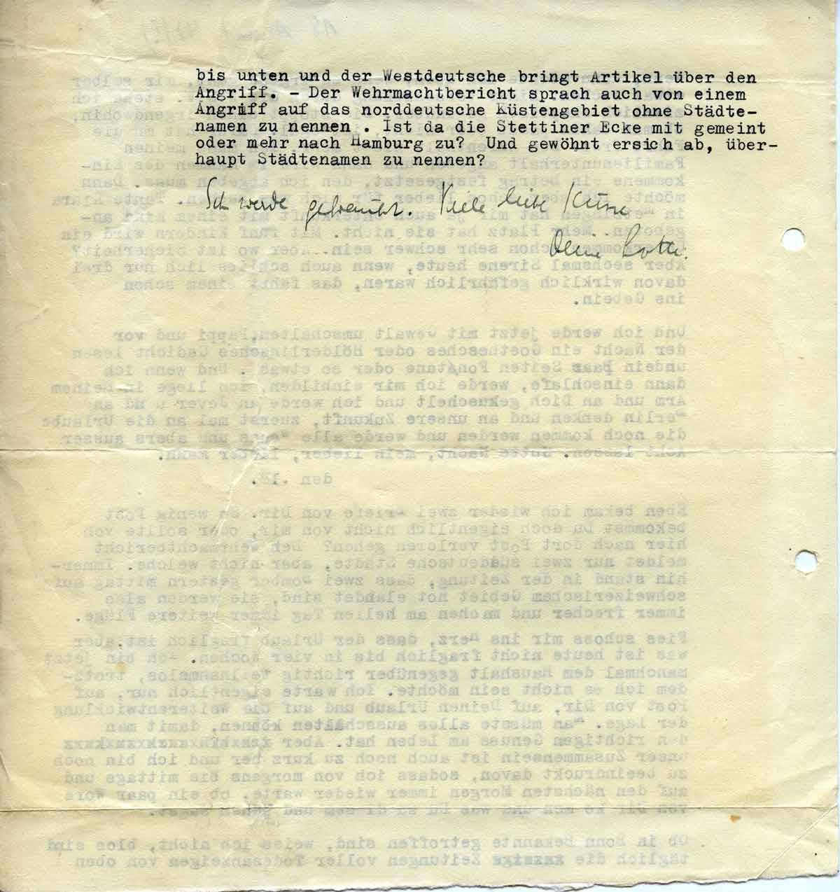 bis unten, und der ‚Westdeutsche' bringt Artikel über den Angriff. - Der Wehrmachtbericht sprach auch von einem Angriff auf das norddeutsche Küstengebiet, ohne Städtenamen zu nennen. Ist da die Stettiner Ecke mit gemeint oder mehr nach Hamburg zu? Und gewöhnt er sich ab, überhaupt Städtenamen zu nennen?