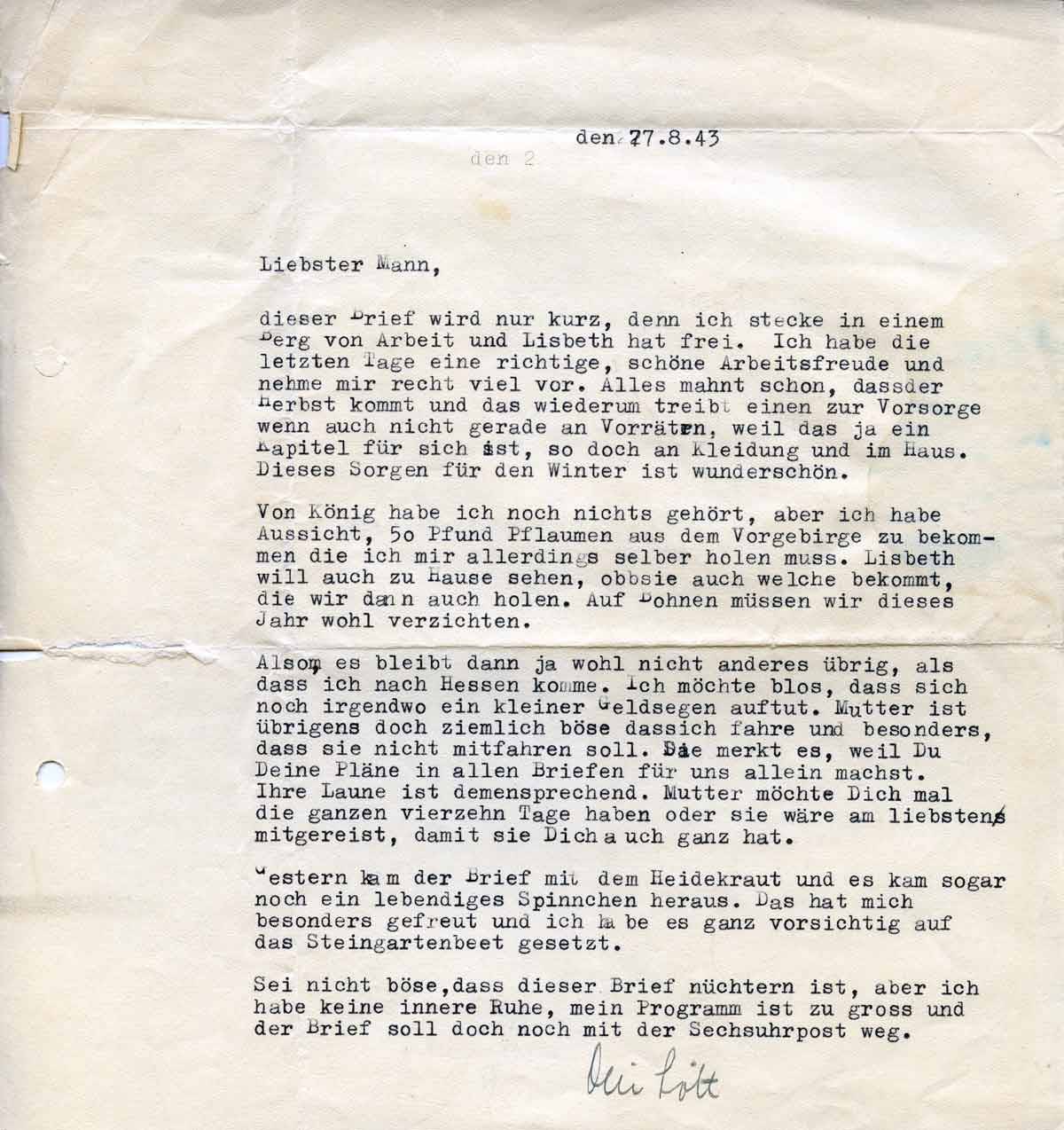 Charlotte Endemann an ihren Mann Harald, 27. August 1943