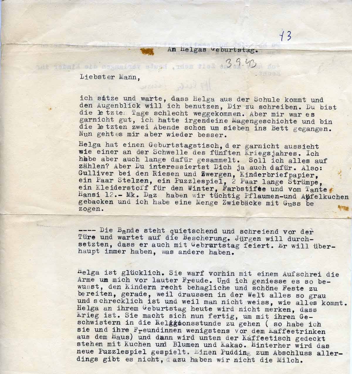 Helga ist glücklich. Sie warf vorhin mit einem Aufschrei die Arme um mich vor lauter Freude. Und ich genieße es so bewusst, den Kindern recht behagliche und schöne Feste zu bereiten, gerade weil draußen in der Welt alles so grau und schrecklich ist und weil man nicht weiß, wie alles kommt. Helga an ihrem Geburtstag wird heute nicht merken, dass Krieg ist. Sie macht sich nun fertig, um mit ihren Geschwistern in die Religionsstunde zu gehen (so habe ich sie und ihre Freundinnen wenigstens vor dem Kaffeetrinken aus dem Haus), und dann wird unten der Kaffeetisch gedeckt stehen mit Kuchen und Blumen und Kakao. Hinterher wird das neue Puzzlespiel gespielt. Einen Pudding zum Abschluss gibt es allerdings nicht, dazu haben wir nicht die Milch.