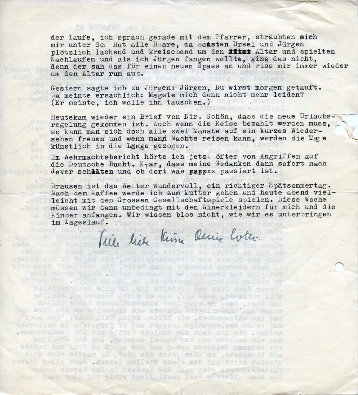 Im Wehrmachtsbericht hörte ich jetzt öfter von Angriffen auf die Deutsche Bucht. Klar, dass meine Gedanken dann sofort nach Jever schalten und ob dort was passiert ist.
