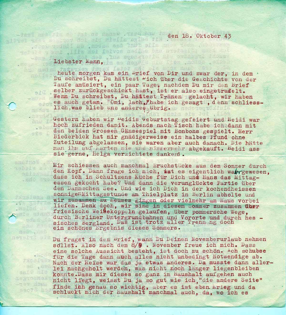 Charlotte Endemann an ihren Mann Harald, 18. Oktober 1943