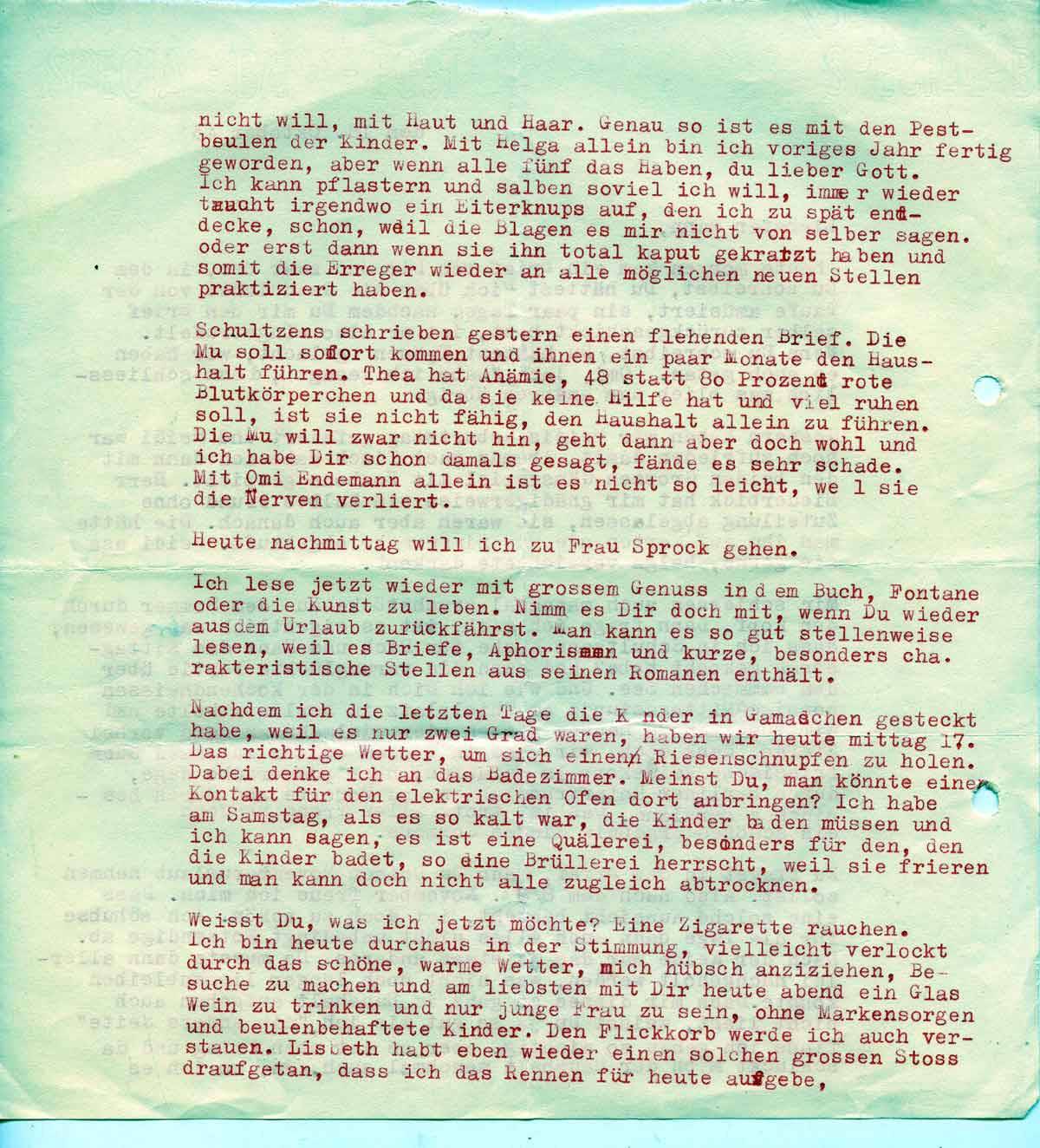 Schultzens schrieben gestern einen flehenden Brief. Die Mu soll sofort kommen und ihnen ein paar Monate den Haushalt führen. Thea hat Anämie, 48 statt 80 Prozent rote Blutkörperchen und da sie keine Hilfe hat und viel ruhen soll, ist sie nicht fähig, den Haushalt allein zu führen. Die Mu will aber nicht, geht aber vielleicht doch, und ich fände es sehr schade, mit Omi Endemann allein ist es nicht so leicht, weil die die Nerven verliert.