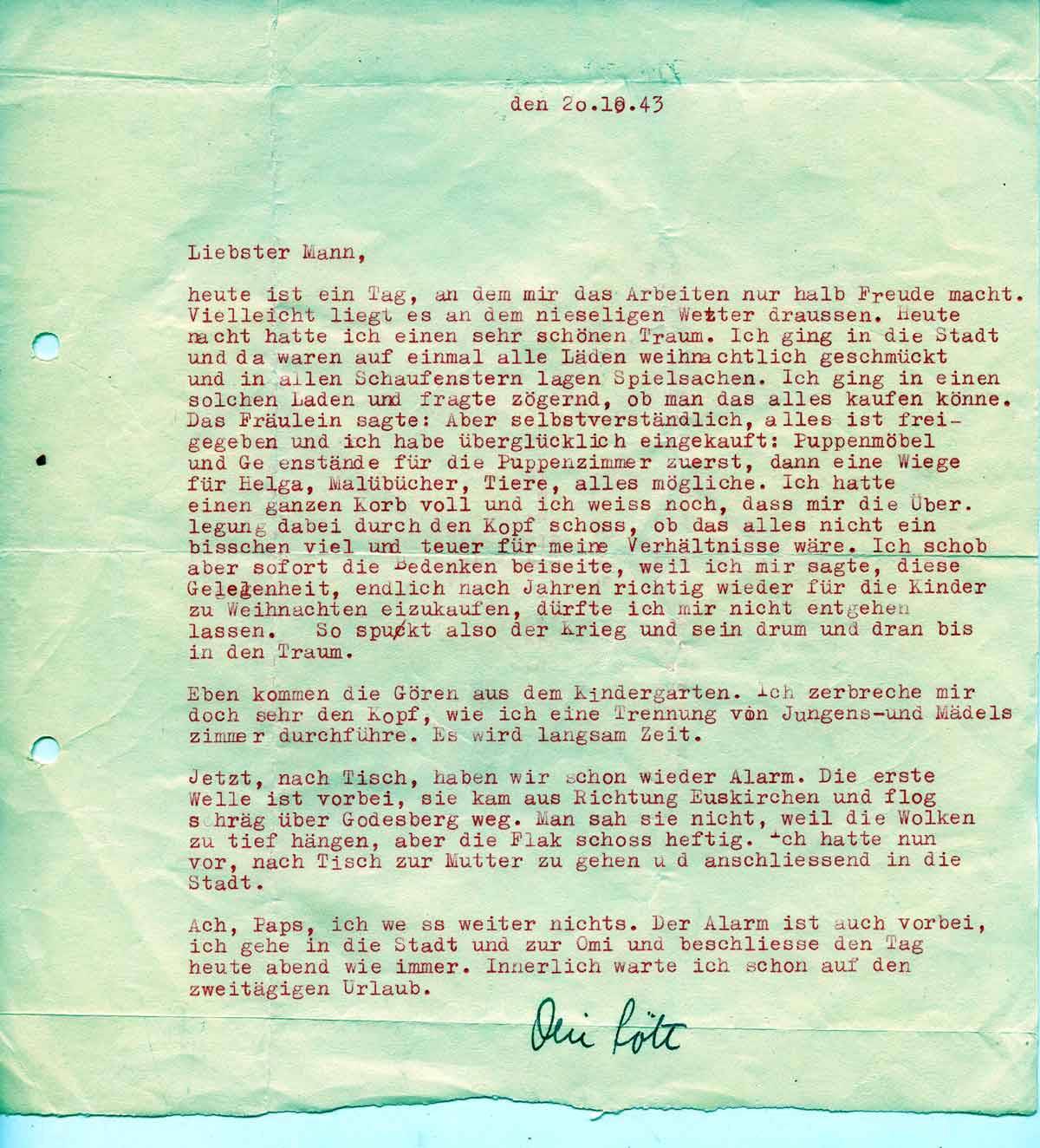 Charlotte Endemann an ihren Mann Harald, 20. Oktober 1943