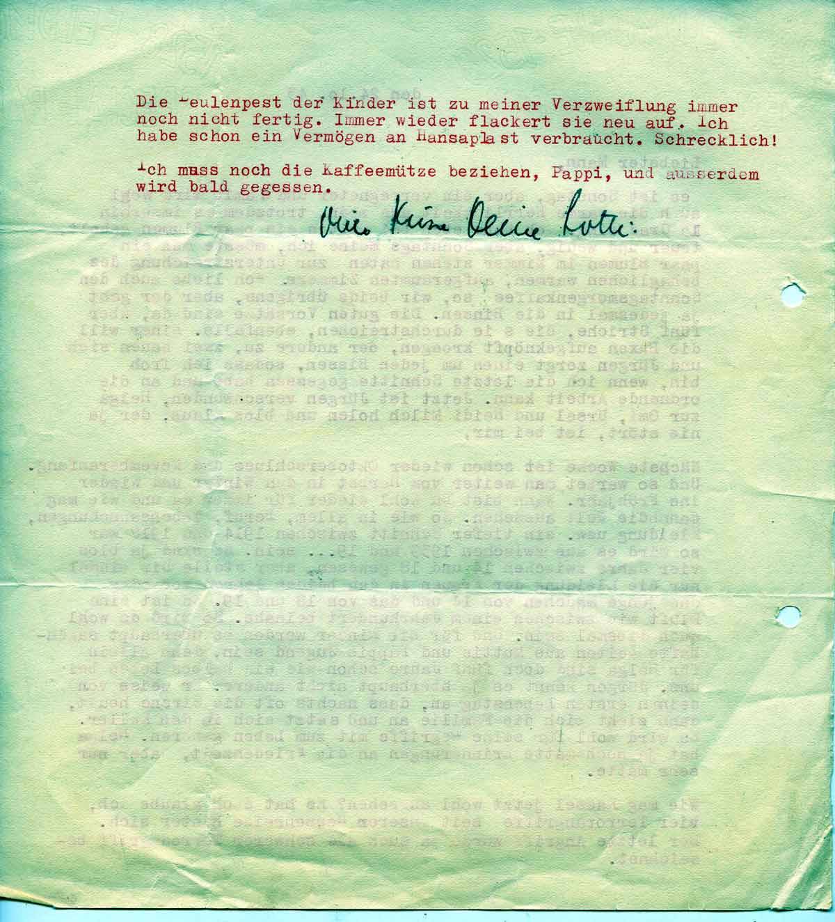 So wie in allem, Beruf, Lebensanschauungen, Kleidungen usw. ein tiefer Schnitt zwischen 1914 und 1918 war, so wird es zwischen 1939 und 19?? ? sein. Es sind ja bloß vier Jahre zwischen 14 und 18 gewesen, aber stelle Dir nur mal die Kleidung der Frauen in den beiden Jahren vor oder das junge Mädchen von 14 und das das von 18. Es ist eine Kluft wie zwischen einem Jahrhundert beinahe. So wird es wohl auch diesmal sein. Und für die Kinder werden es überhaupt sagenhafte Zeiten aus Muttis und Pappis Jugend sein, denn allein für Helga sind doch fünf Jahre schon wie ein halbes Leben bei uns. Jürgen kennt es ja überhaupt nicht anders. Er weiß von seinem ersten Lebenstag an, dass nachts oft die Sirene heult, dann zieht sich die Familie an und setzt sich in den Keller. Es wird für seine Begriffe wohl mit zum Leben gehören. Helga hat ja noch matte Erinnerungen an die Friedenszeit, aber nur sehr matte.