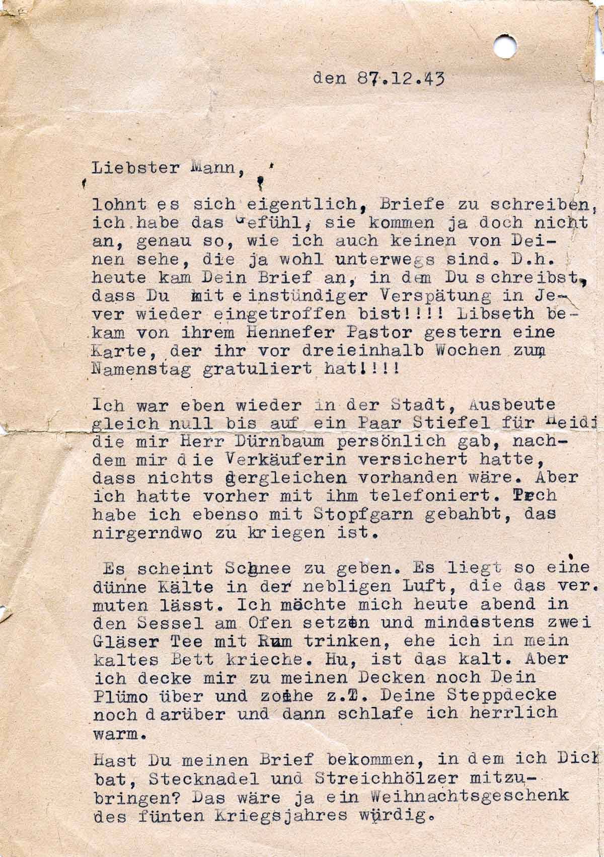 Hast Du meinen Brief bekommen, in dem ich Dich bat, Stecknadeln und Streichhölzer mitzubringen? Das wäre ja ein Weihnachtsgeschenk, des fünften Kriegsjahres würdig.