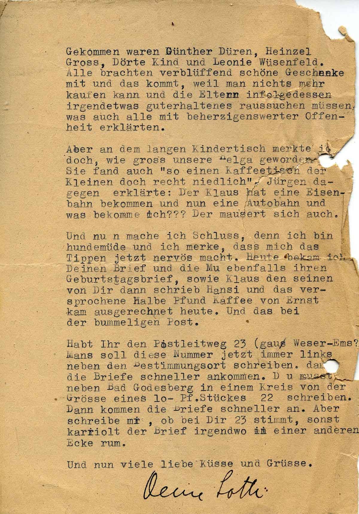 Und nun mache ich Schluss, denn ich bin hundemüde, und ich merke, dass mich das Tippen ganz nervös macht. Heute bekam ich Deinen Brief und die Mu ebenfalls ihren sowie Klaus den seinen von Dir, dann schrieb Hansi, und das versprochene halbe Pfund Kaffee von Ernst kam ebenfalls heute, und das bei der bummeligen Post.