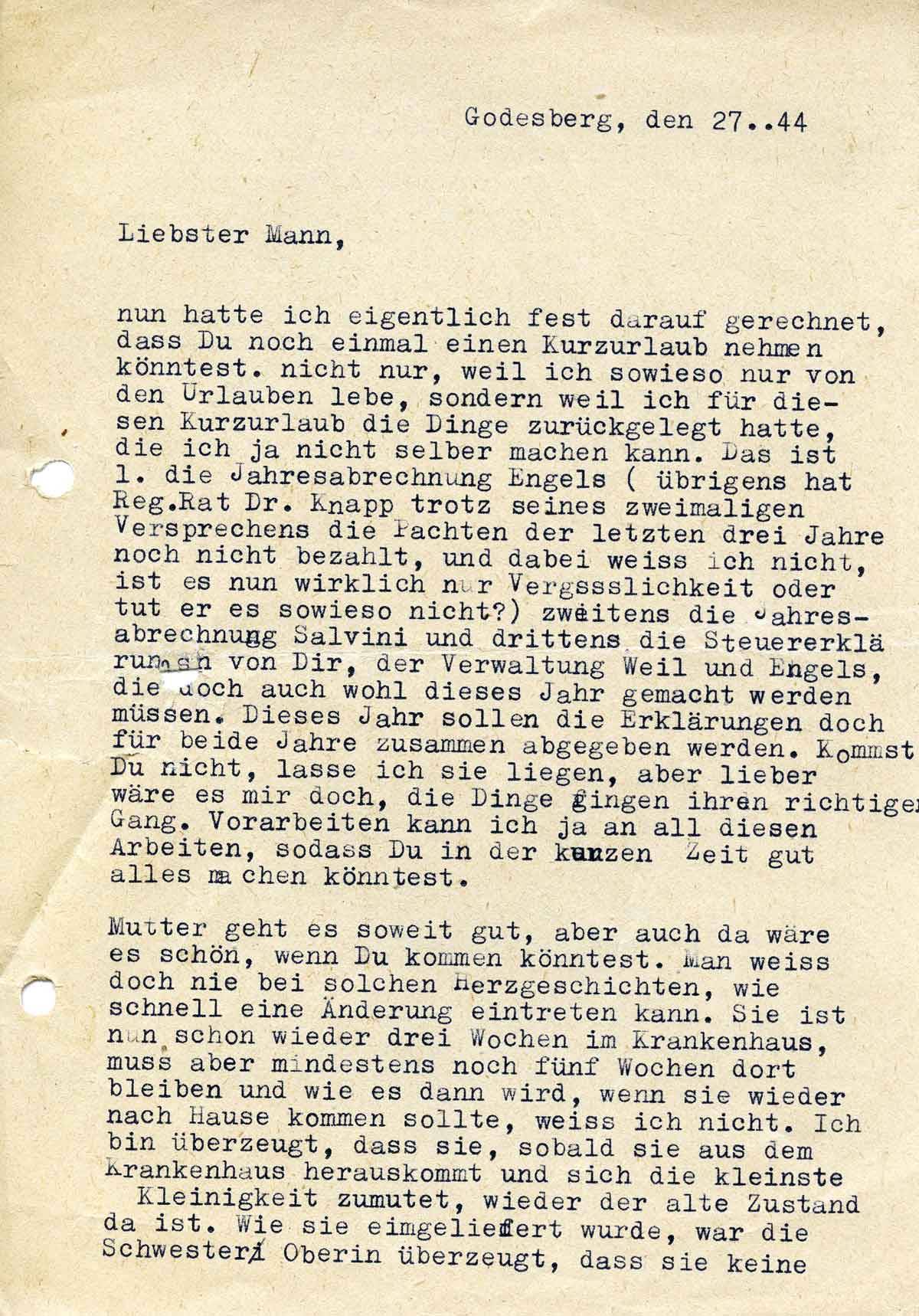 Nun hatte ich eigentlich fest darauf gerechnent, dass Du noch einmal einen Kurzurlaub nehmen könntest, nicht nur, weil ich sowieso nur von den Urlauben lebe, sondern weil ich für diesen Kurzurlaub Dinge zurückgelegt hatte, die ich ja nicht selber machen kann. Das ist 1. die Jahresabrechnung Engels (übrigens hat Reg.Rat. Dr.Knapp totz seines zweimaligen Versprechens die Pachten der letzten drei Jahre noch nicht bezahlt, und dabei weiss ich nicht, ist es nun wirklich nur Vergesslichkeit oder tut er es sowieso nicht?) zweitens die Jahresabrechnung Salvini und drittens die Steuererklärungen von Dir, der Verwaltung Weil und Engels, die doch auch wohl dieses Jahr gemacht werden müssen. Dieses Jahr sollen die Erklärungen doch für beide Jahre zusammen abgegeben werden. Kommst Du nicht, lasse ich sie liegen, aber lieber wäre es mir doch, die Dinge gingen ihren richtigen Gang. Vorarbeiten kann ich ja an all diesen Arbeiten, sodass Du in der kurzen Zeitgut alles machen könntest.