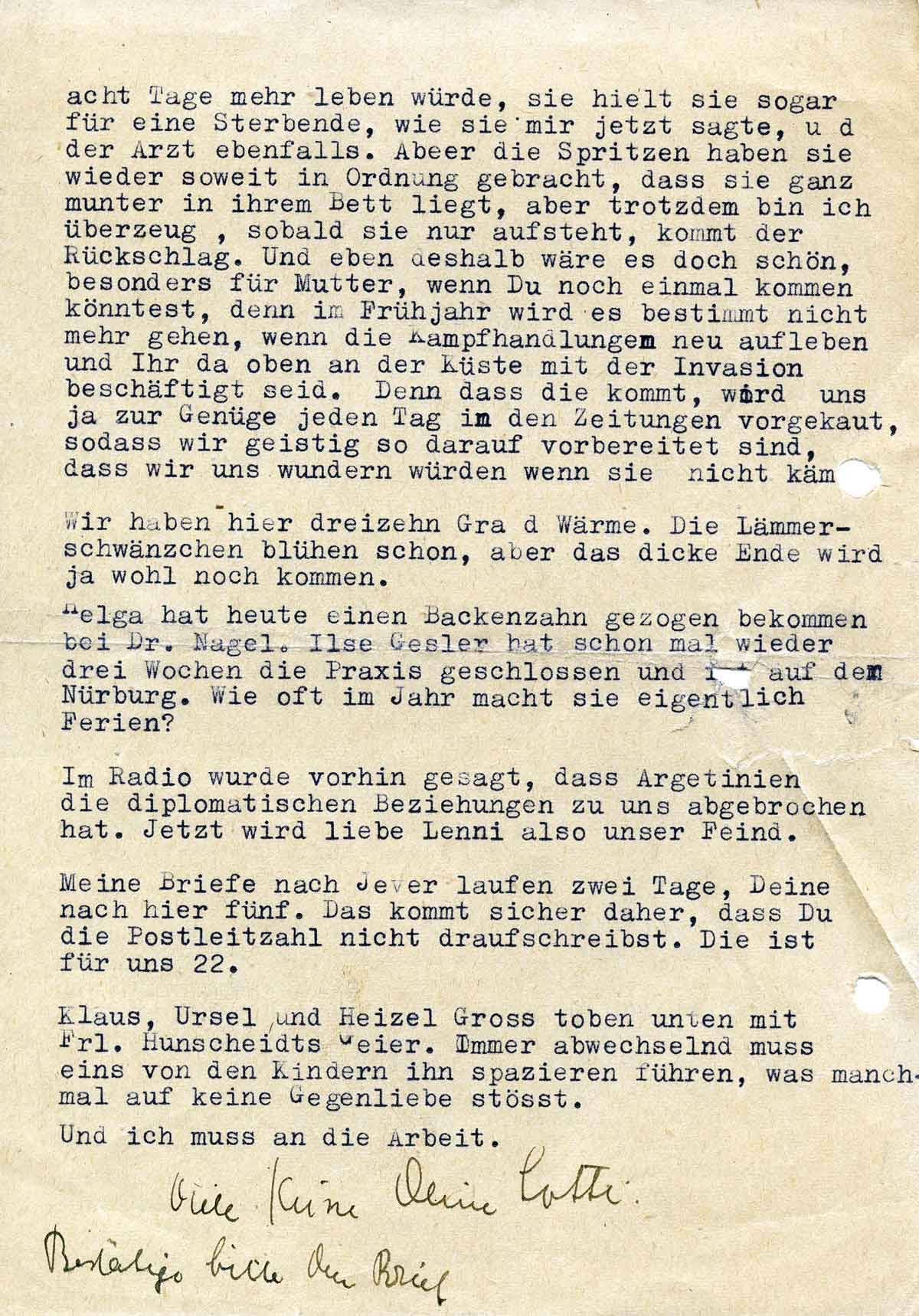 acht Tage mehr leben würde, sie hielt sie sogar für eine Sterbende, wie sie mir jetzt sagte, und der Arzt ebenfalls. Aber die Spritzen haben sie soweit wieder in Ordnung gebracht, dass sie ganz munter in ihrem Bett liegt. Aber trotzdem bin ich überzeugt, sobald sie nur aufsteht, kommt der Rückschlag. Und eben deshalb wäre es doch schön, besonders für Mutter, wenn Du noch einmal kommen könntest, denn im Frühjahr wird es bestimmt nicht mehr gehen, wenn die Kampfhandlungen neu aufleben und ihr da oben an der Küste mit der Invasion beschäftigt seid. Denn dass die kommt, wird uns ja zur Genüge in den Zeitungen vorgekaut, so dass wir geistig so darauf vorbereitet sind, dass wir uns wundern würden, wenn sie nicht kommt.