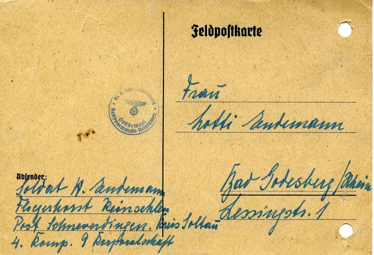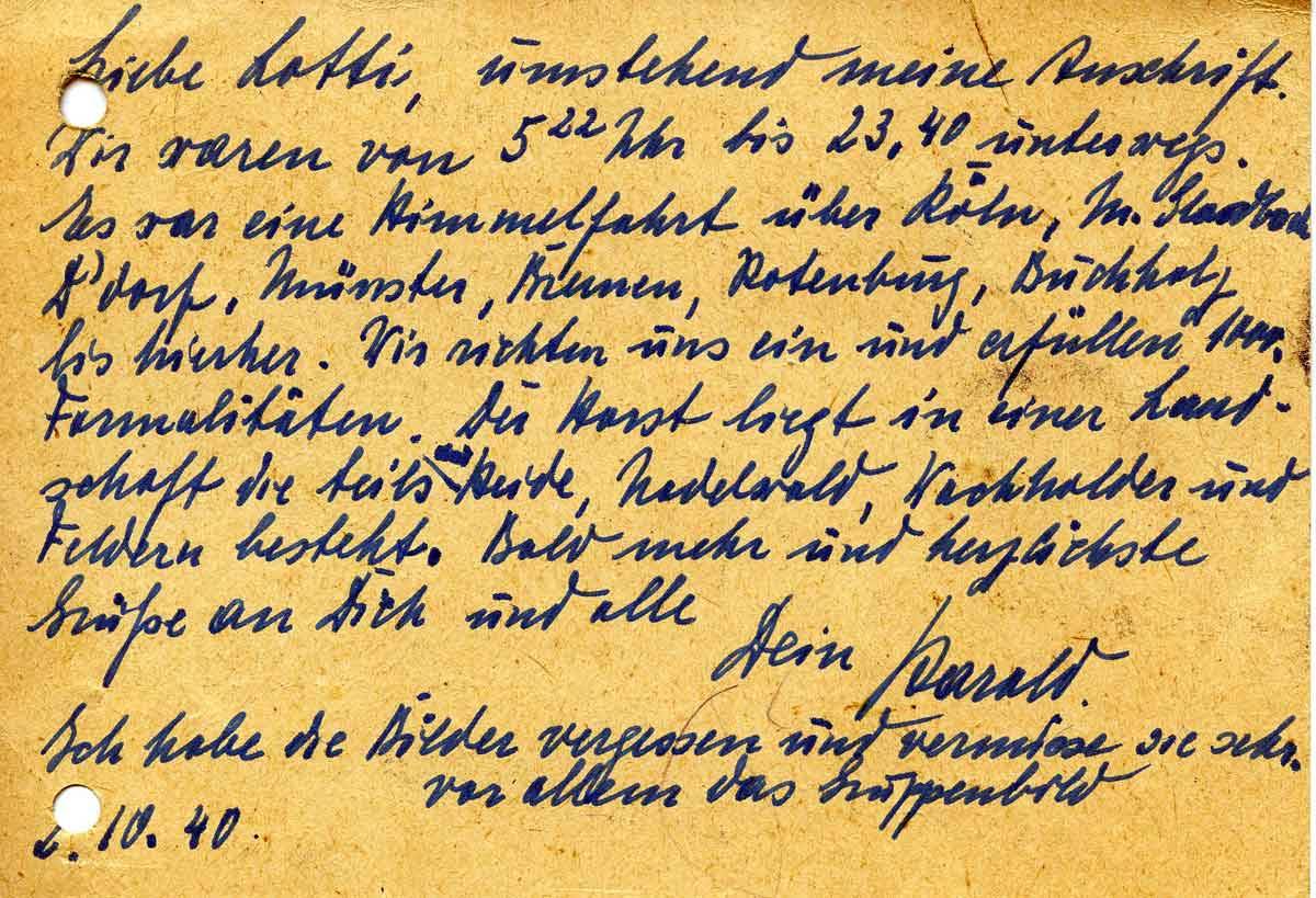 Liebe Lotti, umstehend meine Anschrift. Wir waren von 5:22 Uhr bis 23:40 Uhr unterwegs. Es war eine Himmelfahrt über Köln die Stadt. Die Stationen Düsseldorf Münster, Münster, Bremen, Rotenburg, Buchholz bis hierher wir richten uns ein und erfüllen 1000 Formalitäten. Der Horst liegt in einer Landschaft, die teils aus Heide, Nadelwald, Wacholder und Feldern besteht. Bald mehr und herzlichste Grüße an Dich und alle Dein Harald