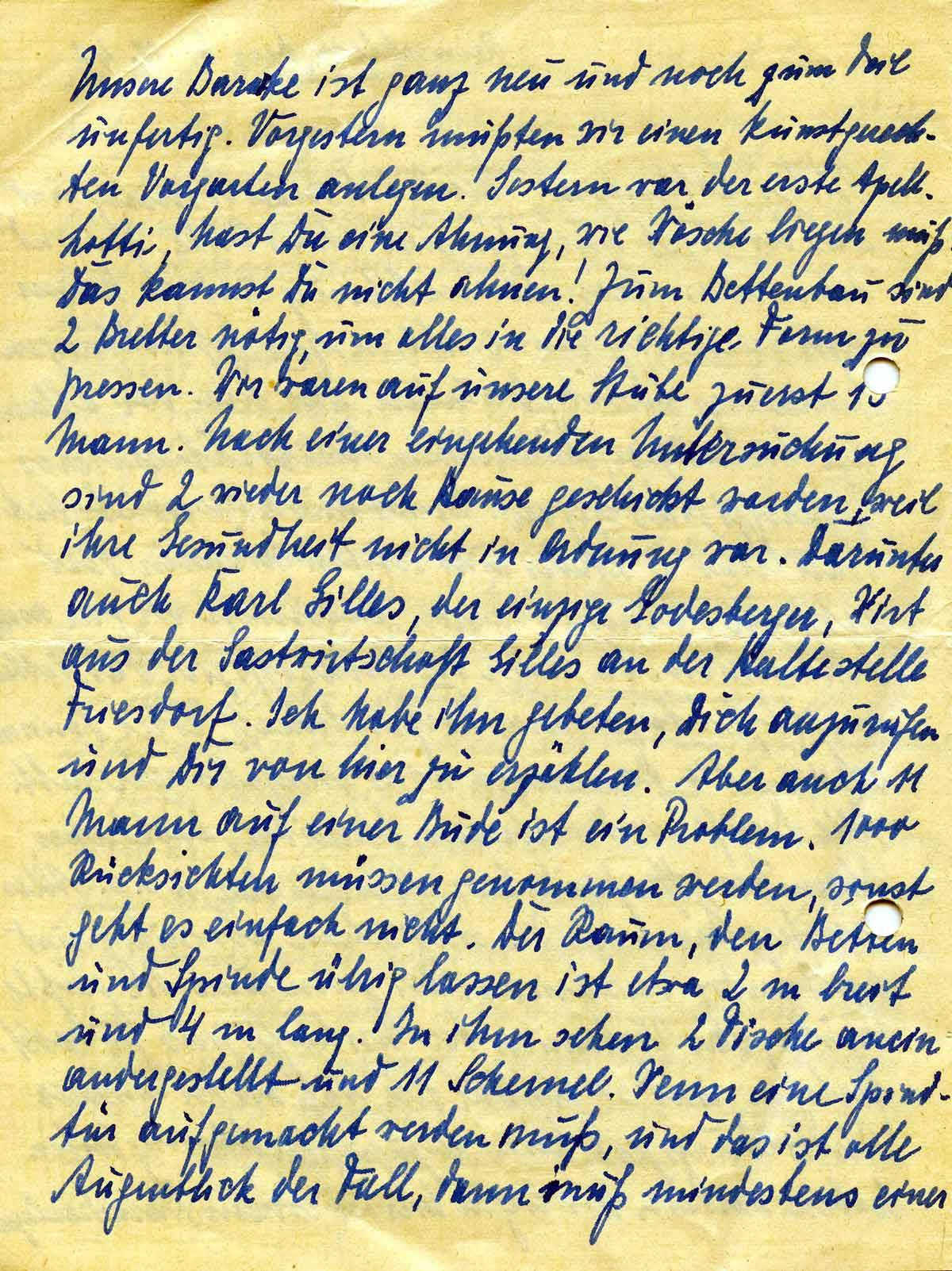 Unsere Baracke ist ganz neu und noch zum Teil unfertig. Vorgestern mussten wir einen kunstgerechten Vorgarten anlegen. Gestern war der erste Apell (!) . Lotti, hast Du eine Ahnung, wie Wäsche liegen muss. Das kannst Du nicht ahnen! Zum Bettenbau sind zwei Bretter nötig, um alles in die richtige Form zu pressen. Wir waren auf unsere Stube zuerst zehn Mann. Nach einer eingehenden Untersuchung sind zwei wieder nach Hause geschickt wurden, weil ihre Gesundheit nicht in Ordnung war. Darunter auch Karl Gilles, der einzige Godesberger, Wirt aus der Gastwirtschaft Gilles an der Haltestelle Friesdorf. Ich habe ihn gebeten, Dich anzurufen und Dir von hier zu erzählen. Aber auch elf Mann auf einer Bude ist ein Problem. 1000 Rücksichten müssen genommen werden, sonst geht es einfach nicht. Der Raum, den Betten und Spinde übrig lassen ist etwa 2 m breit und 4 m lang. In ihm s(t)ehen zwei Tische aneinandergestellt und elf Schemel. Wenn eine Spindtür aufgemacht werden muss, und das ist alle Augenblick der Fall, dann muss mindestens einer eben