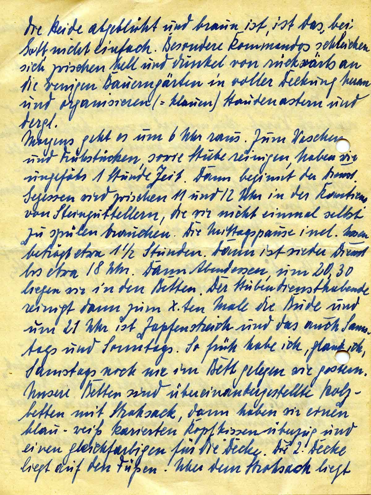 Morgens geht es um 6 Uhr raus. Zum Waschen und Frühstücken sowie Stube reinigen, haben wir ungefähr 1 Stunde Zeit. Dann beginnt der Dienst.. Gegessen wird zwischen 11 und 12 Uhr in der Kantiene von Steinguttellern, die wir nicht einmal selbst zu spülen brauchen. Die Mittagspause incl. Essen beträgt etwa 1 ½ Stunden. Dann ist wieder Dienst bis etwa 18 Uhr. Dann Abendessen, um 20:30 Uhr liegen wir in den Betten. Der Stubendiensthabende reinigt dann zum x-ten Male die Bude und um 21 Uhr ist Zapfenstreich und das auch samstags und sonntags. So früh habe ich, glaub ich, Samstags noch nie im Bett gelegen wie gestern. Unsere Betten sind übereinandergestellte Holzbetten mit Strohsack, dann haben wir einen blau-weiß karierten Kopfkissenüberzug und einen gleichfarbigen für die Decke. Die 2. Decke liegt auf den Füßen. Über dem Strohsack liegt