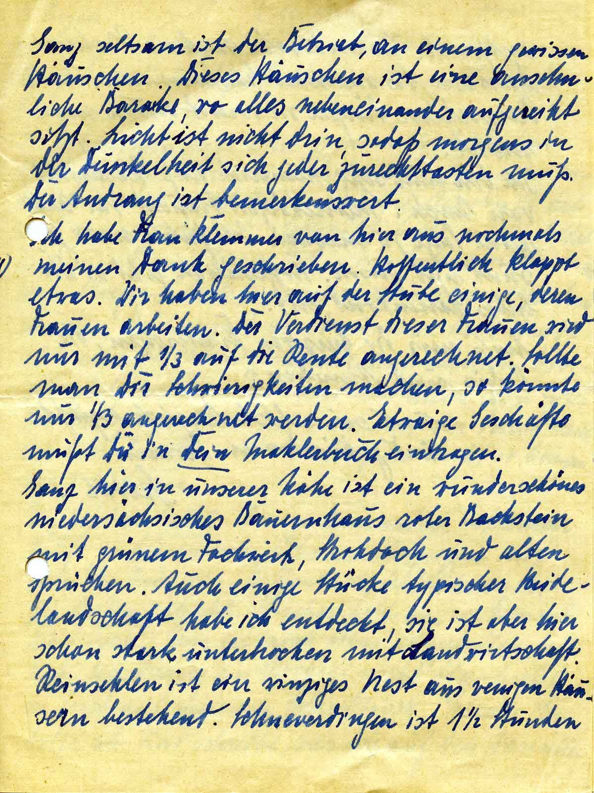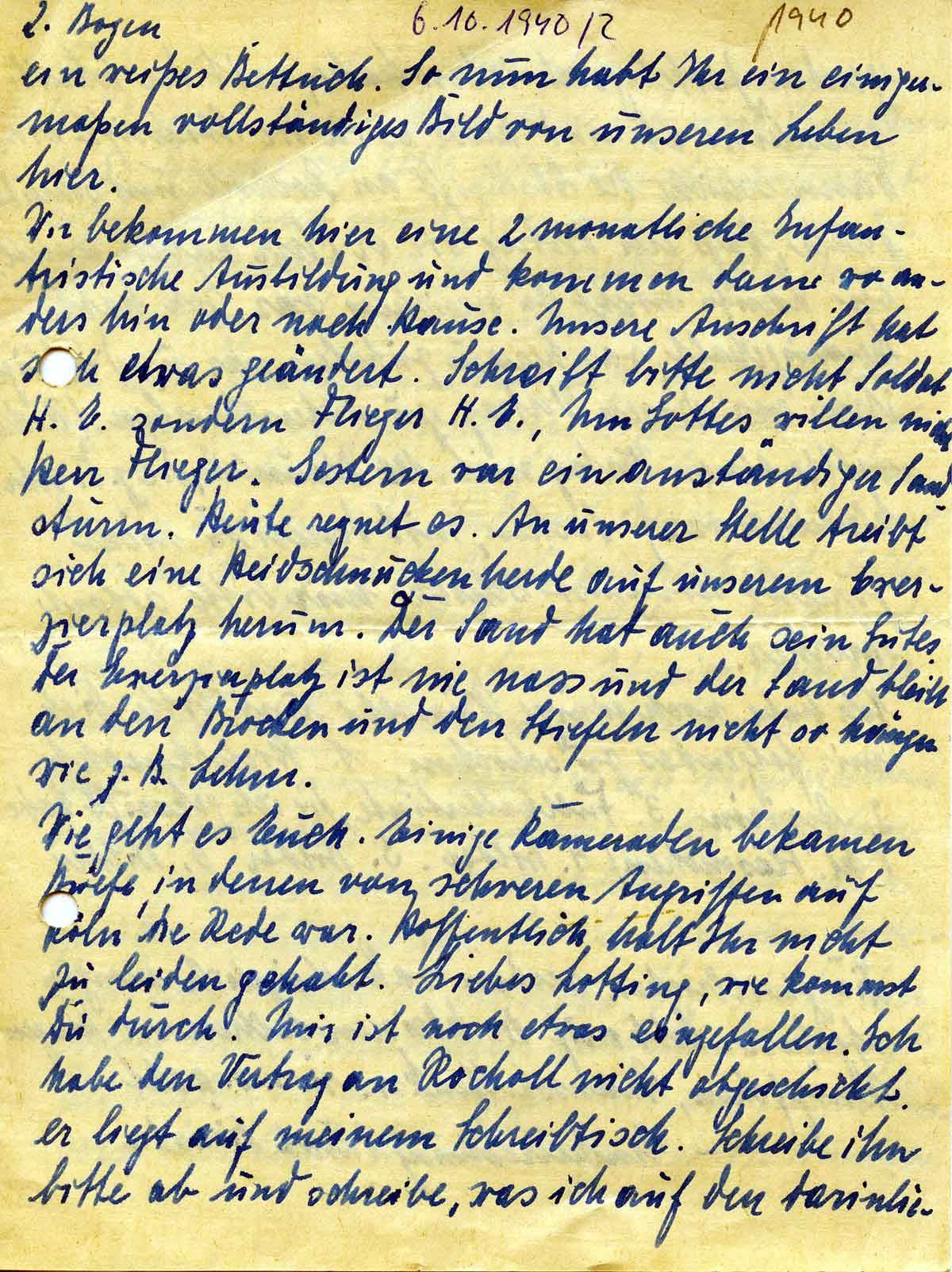 Wir bekommen hier eine zweimonatliche Infanteristische Ausbildung und kommen kaum woanders hin oder nach Hause. Unsere Anschrift hat sich etwas geändert. Schreibt bitte nicht Soldat H. E., sondern Flieger H. E. um Gottes willen (unleserlich) Flieger. Gestern war ein anständiger Sandsturm. Heute regnet es. An unserer Stelle treibt sich eine Heidschnucken-herde auf unserem Exerzierplatz herum. Der Sand hat auch sein Gutes der Exerzierplatz ist nie nass und der Sand bleibt an den Brockenund den Stiefeln nicht so hängen wie z. B.Lehm.
