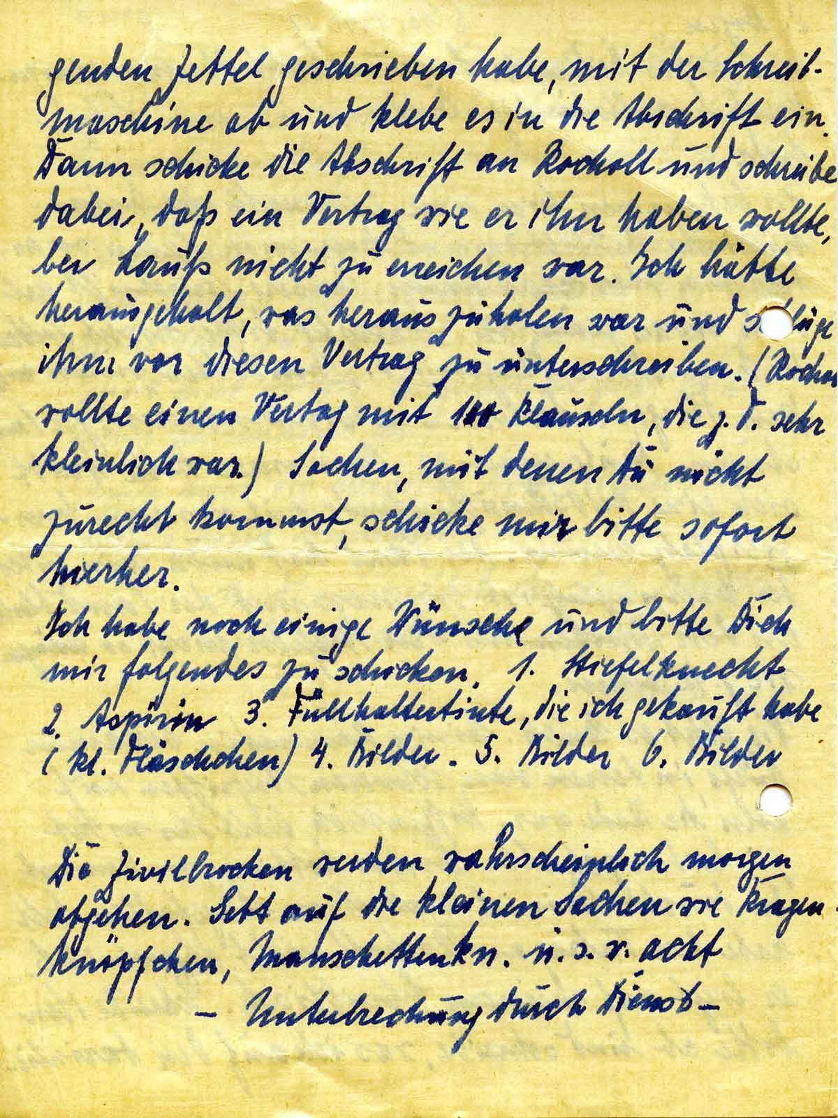 Ich habe noch einige Wünsche und bitte Dich, mir folgendes zu schicken, 1.) Stiefelknecht 2.) Aspirin 3.) Füllhaltertinte, die ich gekauft habe (kl. Fläschchen) 4.) Bilder 5.) Bilder 6.) Bilder
