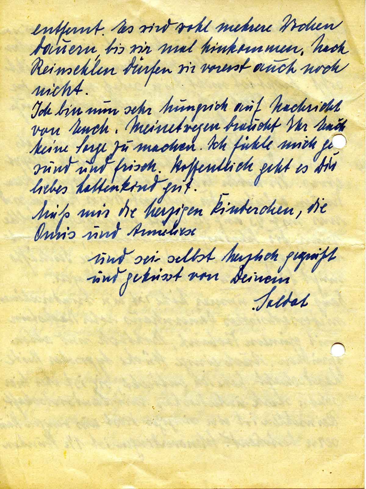 Ich bin nun sehr hungrich auf Nachricht von Euch. Meinetwegen braucht ihr Euch keine Sorgen zu machen. Ich fühle mich gesund und frisch. Hoffentlich geht es Dir liebes Lottenkind gut.