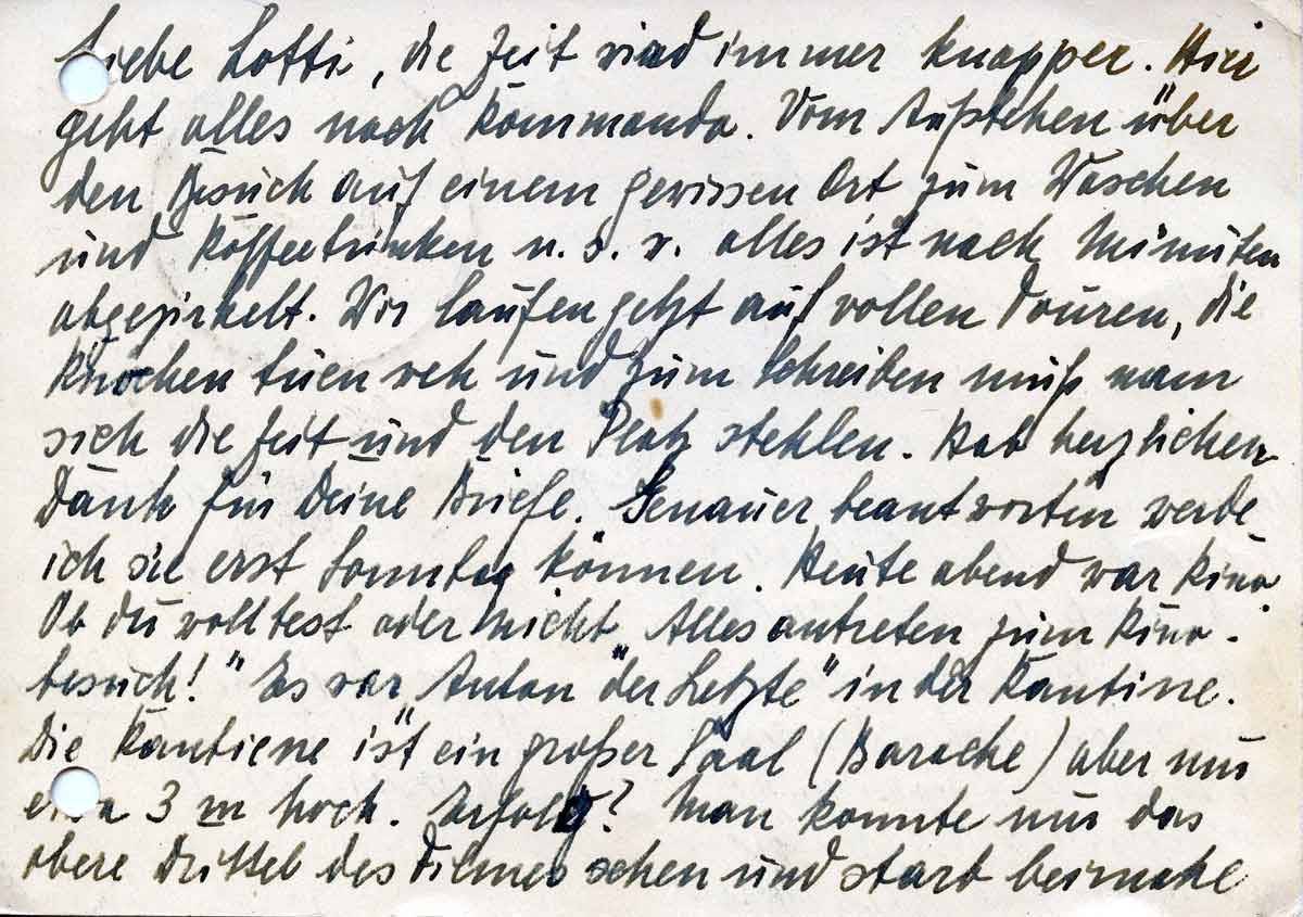 Liebe Lotti, die Zeit wird immer knapper. Hier geht alles nach Kommando. Vom Aufstehen über den Besuch auf einem gewissen Ort zum Waschen und Kaffeetrinken u.s.w. alles ist nach Minuten abgezirkelt. Wir laufen jetzt auf vollen Touren, die Knochen tuen weh und zum Schreiben muss man sich die Zeit und den Platz stehle. Hab herzlichen Dank für Deine Briefe. Genauer beantworten werde ich sie erst Sonntag können. Heute Abend war Kino. Ob Du wolltest oder nicht „Alles antreten zum Kinobesuch! “ Es war “ Anton der Letzte“ in der Kantine. Die Kantiene ist ein großer Saal (Baracke) aber nur eben 3 m hoch. Erfolg? Man konnte nur das obere Drittel des Filmes sehen und starb beinahe