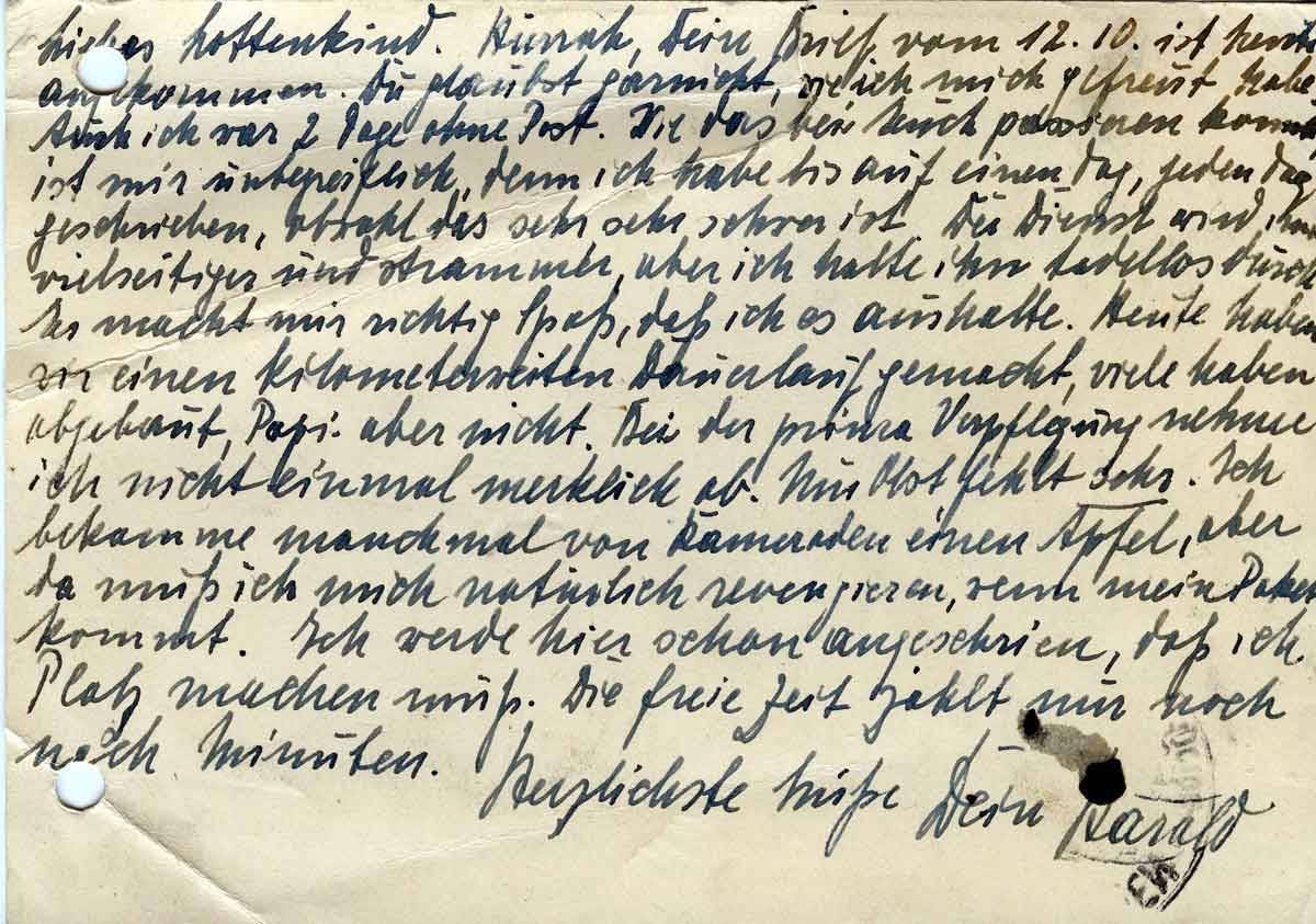 Liebes Lottenkind. Hurrah, dein Brief vom 12. 10. ist heute angekommen. Du glaubst garnicht, wie ich mich gefreut habe. Auch ich war zwei Tage ohne Post. Wie das bei Euch passieren konnte, ist mir unbegreiflich, denn ich habe bis auf einen Tag, jeden Tag geschrieben, obwohl das sehr sehr schwer ist. Der Dienst wird immer vielseitiger und strammer, aber ich hatte ihn tadellos durch. Es macht mir richtig Spaß, dass ich es aushalte. Heute haben wir einen kilometerweiten Dauerlauf gemacht. viele haben abgebaut, Papi aber nicht. Bei der prima Verpflegung nehme ich nicht einmal merklich ab. Nur Obst fehlt sehr. Ich bekomme manchmal von Kameraden einen Apfel, aber da muss ich mich natürlich revengieren, wenn mein Paket kommt. Ich werde hier schon angeschrien, daß ich Platz machen muss. Die freie Zeit zählt nur noch Minuten.