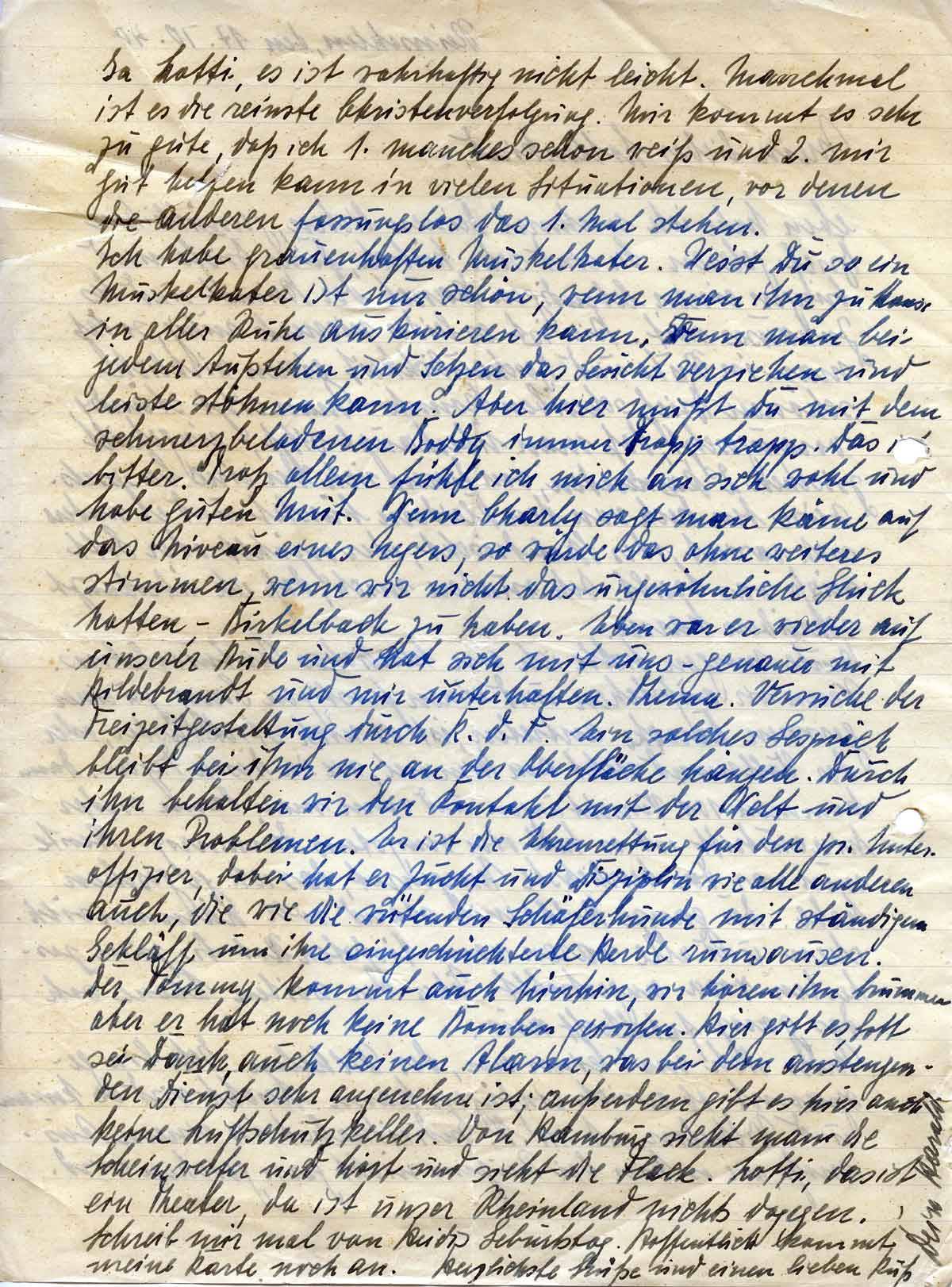 Ich habe grauenhaften Muskelkater. Weist (!) Du, so ein Muskelkater ist nur schön, wenn man ihn zu Haus in aller Ruhe auskurieren kann. Wenn man bei jedem Aufstehen und Setzen das Gesicht verziehen und leise stöhnen kann. Aber hier musst Du mit dem schmerzbeladenen Boddy (!) immer trapp trapp. Das ist bitter. Trotz allem fühle ich mich an sich wohl und habe guten Mut. Wenn Charly sagt, man käme auf das Niveau eines Negers, so würde das ohne weiteres stimmen, wenn wir nicht das ungewöhnliche Glück hätten – Birkelbach zu haben. Eben war er wieder auf unserer Bude und hat sich mit uns – genauer mit Hildebrandt und mir unterhalten. Thema Versuche der Freizeitgestaltung durch K.d.F. Ein solches Gespräch bleibt bei ihm nie an der Oberfläche hängen. Durch ihn behalten wir den Kontakt mit der Welt und ihren Problemen. Er ist die Ehrenrettung für den pr(eußischen) Unteroffizier, dabei hat er Zucht und Disziplin wie alle anderen auch, die wie die wütenden Schäferhunde mit ständigem Glück lässt um ihre eingeschüchterte Herde rumsausen. Der Tommy kommt auch hierhin, wir hören ihn brummen aber er hat noch keine Bomben geworfen. Hier gibt es Gott sei Dank auch keinen Alarm, was bei dem anstrengenden Dienst sehr angenehm ist; außerdem gibt es hier auch keine Luftschutzkeller. Von Hamburg sieht man die Scheinwerfer und hört und sieht die Flack(!). Lotti, das ist ein Theater, da ist unser Rheinland nichts dagegen. Schreib mir mal von Heidis Geburtstag. Hoffentlich kommt meine Karte noch an. Herzlichste Grüße und einen lieben Gruß