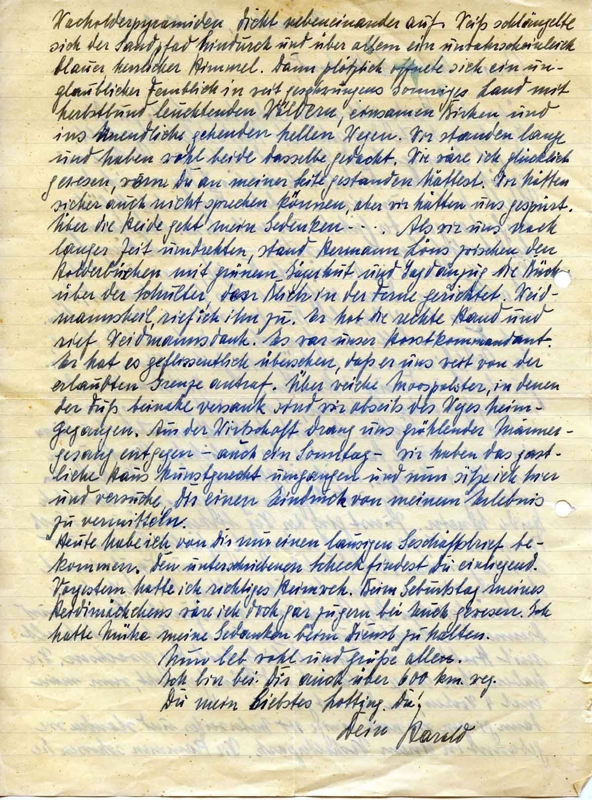 dicht nebeneinander auf. Weiß schlängelte sich der Sandpfad hindurch und über allem ein unwahrscheinlich blauer herrlicher Himmel. Dann plötzlich öffnete sich ein unglaublicher Fernblick in weit geschwungene sonniges Land mit herbstbunt leuchtenden Wäldern, einsamen Birken und ins Unendliche gehenden hellen Wegen. Wir standen lange und haben wohl beide dasselbe gedacht. Wie wäre ich glücklich gewesen, wenn Du an meiner Seite gestanden hättest. Wir hätten sicher auch nicht sprechen können, aber wir hätten uns gespürt. Über die Heide geht meine Gedenken - - -. Als wir uns nach langer Zeit umdrehten, stand Hermann Löns zwischen den Holderbüschen mit grünem Jägerhut und Jagdanzug, die Büchse über der Schulter, den Blick in die Ferne gerichtet. Weidmannsheil, rief ich ich zu., Er hob die rechte Hand und rief Weidmannsdank. Es war unser Horstkommandant. Er hat es geflissentlich übersehen, daß er uns weit von der erlaubten Grenze antraf. Über weiche Moospolster, in denen der Fuß beinahe versank sind wir abseits des Weges heimgegangen. Aus der Wirtschaft drang uns grölender Männergesang entgegen – auch am Sonntag – wir haben das gastliche Haus kunstgerecht umgangen und nun sitze ich hier und versuche, Dir einen Eindruck von meinem Erlebnis zu vermitteln.