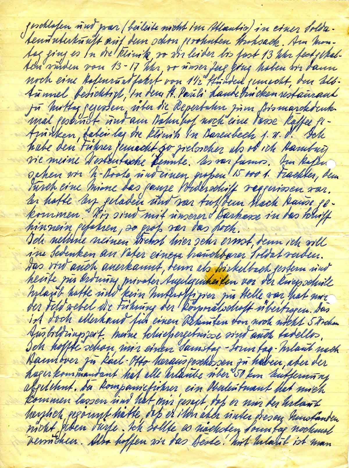 geschlafen und zwar (beileibe nicht im Atlantic) in einer Soldatenunterkunft auf dem schon gewohnten Strohsack. Am Montag ging es in die Klinik, wo wir leider bis fast 13:00 Uhr festgehalten wurden von 13 bis 17:00 Uhr wo unser Zug ging, haben wir dann noch eine Hafenrundfahrt von anderthalb Stunden gemacht, den Elbtunnel besichtigt, in dem St. Pauli Landebrückenrestaurant zu Mittag gegessen, über die Reeperbahn zum Bismarckdenkmal (unleserlich) und am Bahnhof noch eine Tasse Kaffee getrunken, dabei lag die Klinik in Barenbeck (?) f.w.o.(?). Ich habe den Führer gemacht so zielsicher, als ob ich Hamburg wie meine Westentasche kennt. Es war famos. Am Hafen sahen wir U-Boote und einen großen 15.000 t Frachter, dem durch eine Miene (!) das ganze Vorderschiff weggerissen war. Er hatte Erz geladen und war trotzdem nach Hause gekommen. Wir sind mit unserer Barkasse in das Schiff hinein gefahren, so groß war das Loch.