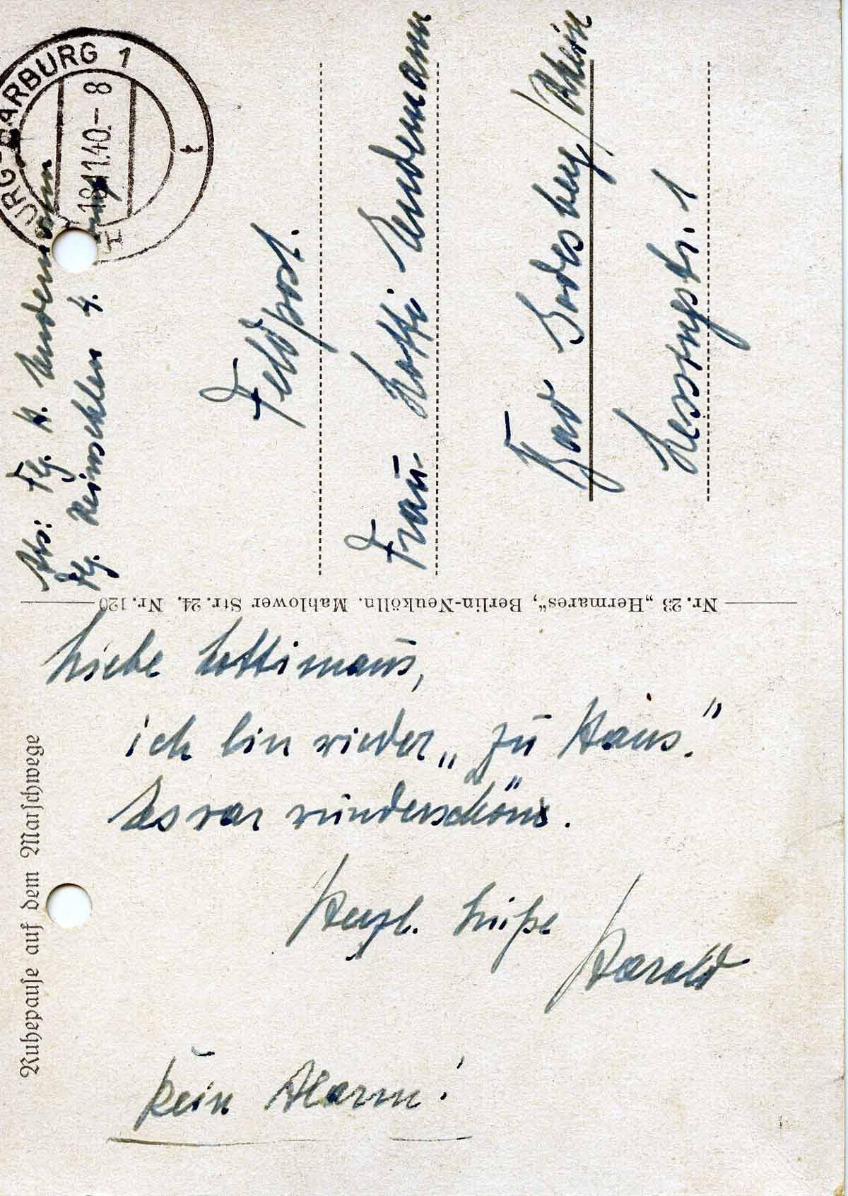 Harald Endemann an seine Frau Charlotte, 18. November 1940 [Postkarte Hamburg-Harburg 18.11.40] Liebe Lottimaus, ich bin wieder „zu Haus“. Es war wunderschön. Herzl. Grüße Harald kein Alarm!
