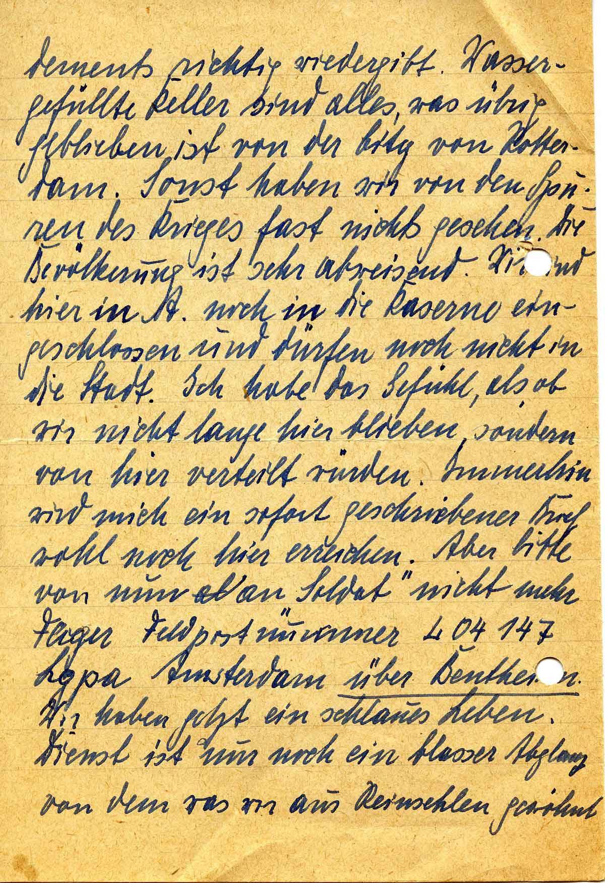 dements richtig wiedergibt. Wassergefüllte Keller sind alles, was übrig geblieben ist von der City von Rotterdam. Sonst haben wir von den Spuren des Krieges fast nichts gesehen. Die Bevölkerung ist sehr abweisend. Wir sind hier in A. Noch in die Kaserne eingeschlossen und dürfen noch nicht in die Stadt. Ich habe das Gefühl, als ob wir nicht lange hier blieben, sondern von hier verteilt würden. Immerhin wird mich ein sofort geschriebener Brief wohl noch hier erreichen. Aber bitte von nun an „Soldat“ nicht mehr Flieger Feldpostnummer 407147 Lgpa Amsterdam über Bentheim. Wir haben jetzt ein schlaues Leben. Dienst ist nur noch ein blasser Abglanz von dem was wir aus Reinsehlen gewöhnt
