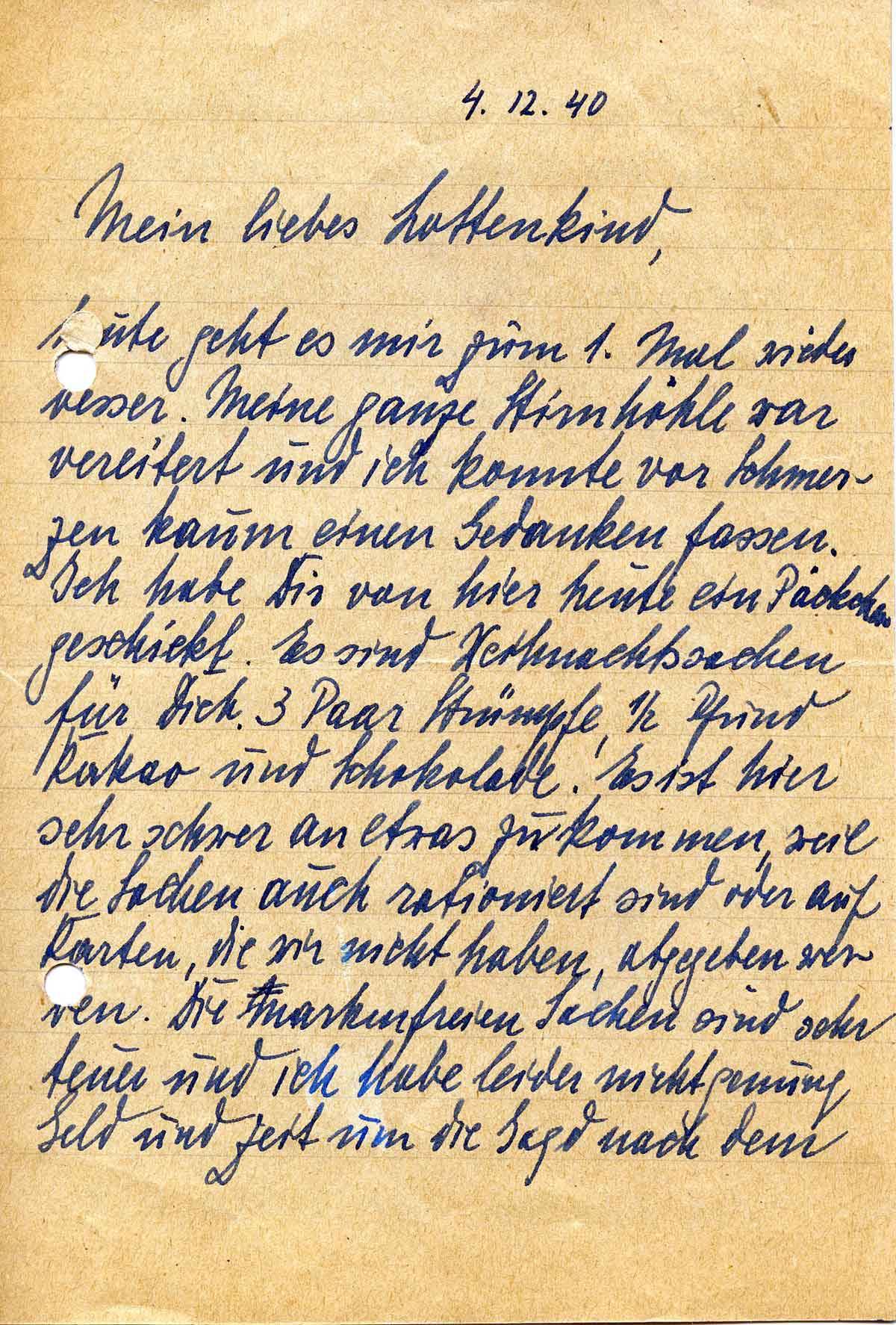heute geht es mir zum ersten Mal wieder besser. Meine ganze Stirnhöhle war vereitert und ich konnte vor Schmerzen kaum einen Gedanken fassen. Ich habe Dir von hier heute ein Päckchen geschickt. Es sind Weihnachtssachen für Dich. 3 Paar Strümpfe, ½ Pfund Kakao und Schokolade. Es ist hier sehr schwer an etwas zu kommen, weil die Sachen auch rationiert sind oder auf Karten, die wir nicht haben, abgegeben werden. Die markenfreien Sachen sind sehr teuer und ich habe leider nicht genug Geld und Zeit um die Jagd nach dem