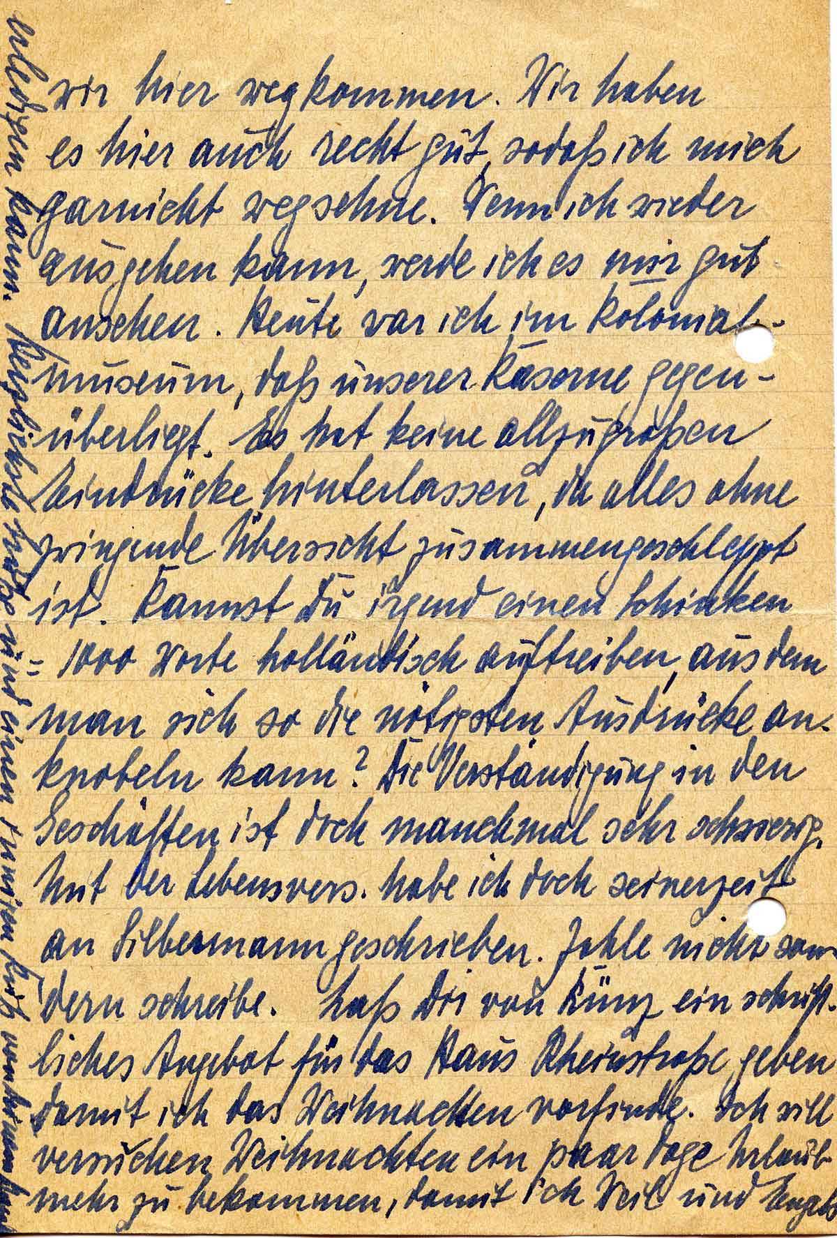 wir hier wegkommen. Wir haben es hier auch recht gut, so daß ich mich garnicht wegsehne. Wenn ich wieder ausgehen kann, werde ich es mir gut ansehen. Heute war ich im Kolonialmuseum, dass unserer Kaserne gegenüber liegt. Es hat keinen allzu großen Eindrücke hinterlassen, weil alles ohne zwingende Übersicht zusammengeschleppt ist. Kannst Du irgend einen Schinken (=Buch)1000 Worte holländisch auftreiben, aus dem man sich die nötigsten Ausdrücke ausknobeln kann? Die Verständigung in den Geschäften ist doch manchmal sehr schwierig. Mit der Lebensvers. habe ich doch seinerzeit an Silbermann geschrieben. Zahle nicht sondern schreibe. Lass Dir von Künz ein schriftliches Angebot für das Haus Rheinstraße geben, damit ich das Weihnachten vorfinde. Ich will versuchen Weihnachten ein paar Tage Urlaub mehr zu bekommen, damit ich Weil und Engels erledigen kann.