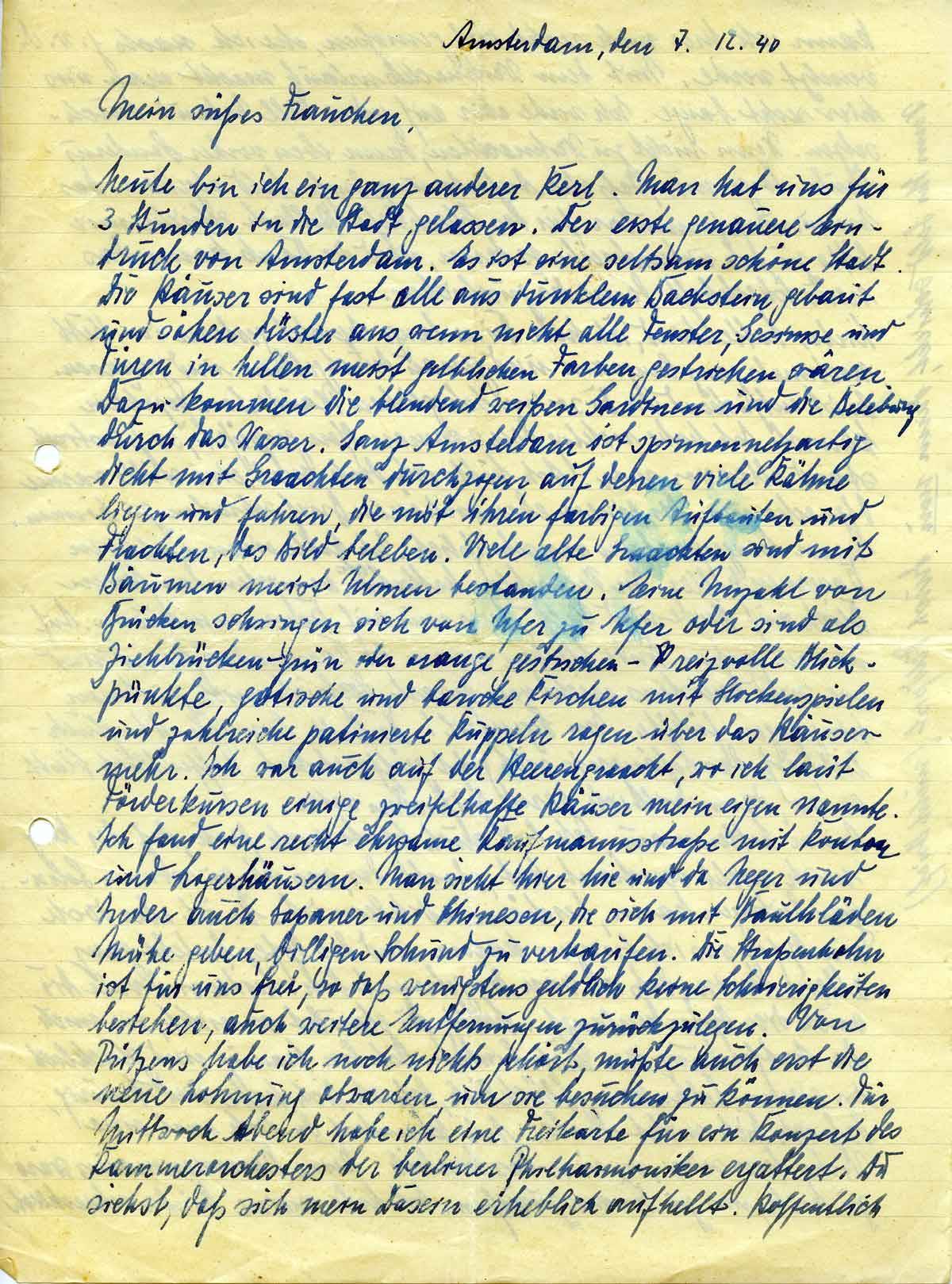 heute bin ich ein ganz anderer Kerl. Man hat uns für 3 Stunden in die Stadt gelassen. Der erste genauere Eindruck von Amsterdam. Es ist eine seltsam schöne Stadt. Die Häuser sind fast alle aus dunklem Backstein gebaut und sähen düster aus, wenn nicht alle Fenster, Gesimse und Türen in hellen meist gelblichen Farben gestrichen wären. Dazu kommen die blendend weißen Gardinen und die Belebung durch das Wasser. Ganz Amsterdam ist spinnennetzartig dicht mit Graachten durchzogen, auf denen viele Kähne liegen und fahren, die mit ihren farbigen Aufbauten und Frachten das Bild beleben. Viele alte Graachten sind mit Bäumen meist Ulmen bestanden. Eine Unzahl von Brücken schwingen sich von Ufer zu Ufer oder sind als Ziehbrücken grün oder orange gestrichen – reizvoller Blickpunkte, gotische und barocke Kirchen mit Glockenspielen und zahlreiche patinierte Kuppeln ragen über das Häusermeer. Ich war auch auf der Heerengraacht, wo ich laut Förderkursen einige zweifelhafte Häuser mein eigen nannte ich fand eine recht elegante Kaufmannsstraße mit Konto und Lagerhäusern. Man sieht hier hier und da Neger und Inder auch Japaner und Chinesen, die sich mit Bauchläden Mühe geben, billigen Schund zu verkaufen. Die Straßenbahn ist für uns frei, so das wenigstens geldlich keine Schwierigkeiten bestehen, auch weitere Entfernungen zurückzulegen. Von Pützens habe ich noch nichts gehört, müsste auch erst die neue Wohnung abwarten, um sie besuchen zu können. Für Mittwoch Abend habe ich eine Freikarte für ein Konzert des Kammerorchesters der berliner Philharmoniker ergattert. Du siehst, dass sich mein Dasein erheblich aufhellt. Hoffentlich