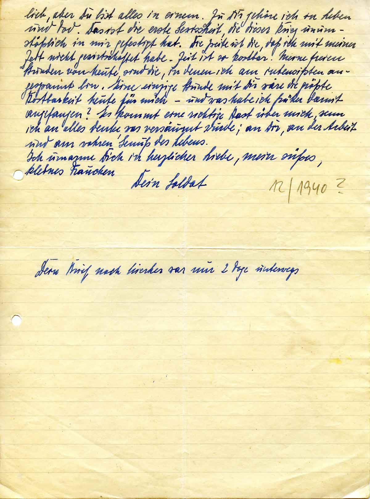 Meine Lottenmaus, ich bin auch heute noch froh, dass der Krieg mich nicht verschont hat, obwohl das, was ich zu seinem Gelingen beitragen kann, beschämend klein ist. Es ist aber doch ein Opfer was ich bringen kann und das Opfer besteht ganz allein darin, dass ich von Dir getrennt bin. Leider wird von Dir auch dies Opfer verlangt. Lotti, Du glaubst es nicht, wie mich die Entfernung an Dich bindet. Ich bin traurig und glücklich in einem Gedanken. Glücklich, dass ich Dich habe und traurig, dass ich Dich nicht habe. Ach könntest Du doch mal eine Woche hier sein, wie wäre das herrlich. Keine Kasernenmauer wäre zu hoch, um zu Dir auszureißen. Ich habe meine Kinder schrecklich