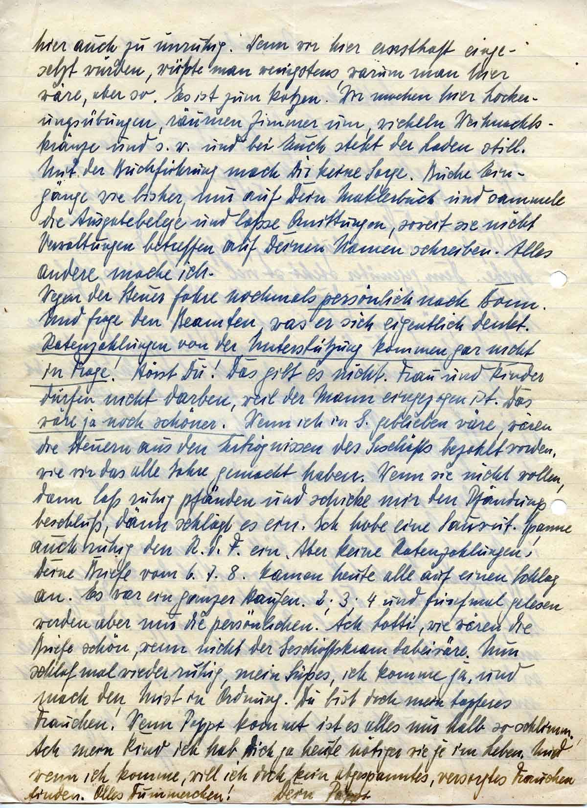 Wegen der Steuer fahre nochmals persönlich nach Bonn. Und frage den Beamten, was er sich eigentlich denkt. Ratenzahlungen von der Unterstützung kommen gar nicht in Frage! Hörst Du! Das gibt es nicht. Frau und Kinder dürfen nicht darben, weil der Mann eingezogen ist. Das wäre ja noch schöner. Wenn ich in G. geblieben wäre, wären die Steuern aus den Erträgnissen des Geschäfts bezahlt worden, wie wir das alle Jahre gemacht haben. Wenn sie nicht wollen, dann lass ruhig pfänden und schicke mir den Pfändungsbeschluss, dann schlägt es ein. Ich habe eine Sauwut. Spanne auch ruhig den R.d.F. Ein. Aber keine Ratenzahlungen! Deine Briefe vom 6.7.8. kamen heute alle auf einen Schlag an es war ein ganzer Haufen. 2. 3. 4. und fünfmal gelesen werden aber nur die persönlichen. Ach Lotti, wie wären die Briefe schön wenn nicht der Geschäftskram dabei wäre. Nun schlaf mal wieder ruhig, mein Süßes, ich komme ja, und mache den Mist in Ordnung. Du bist doch mein tapferes Frauchen. Wenn Pappi kommt ist alles nur halb so schlimm. Ach mein Kind ich habe Dich ja heute nötiger wie je im Leben. Und wenn ich komme, will ich kein abgespanntes, versorgtes Frauchen finden. Olles Dummerchen!