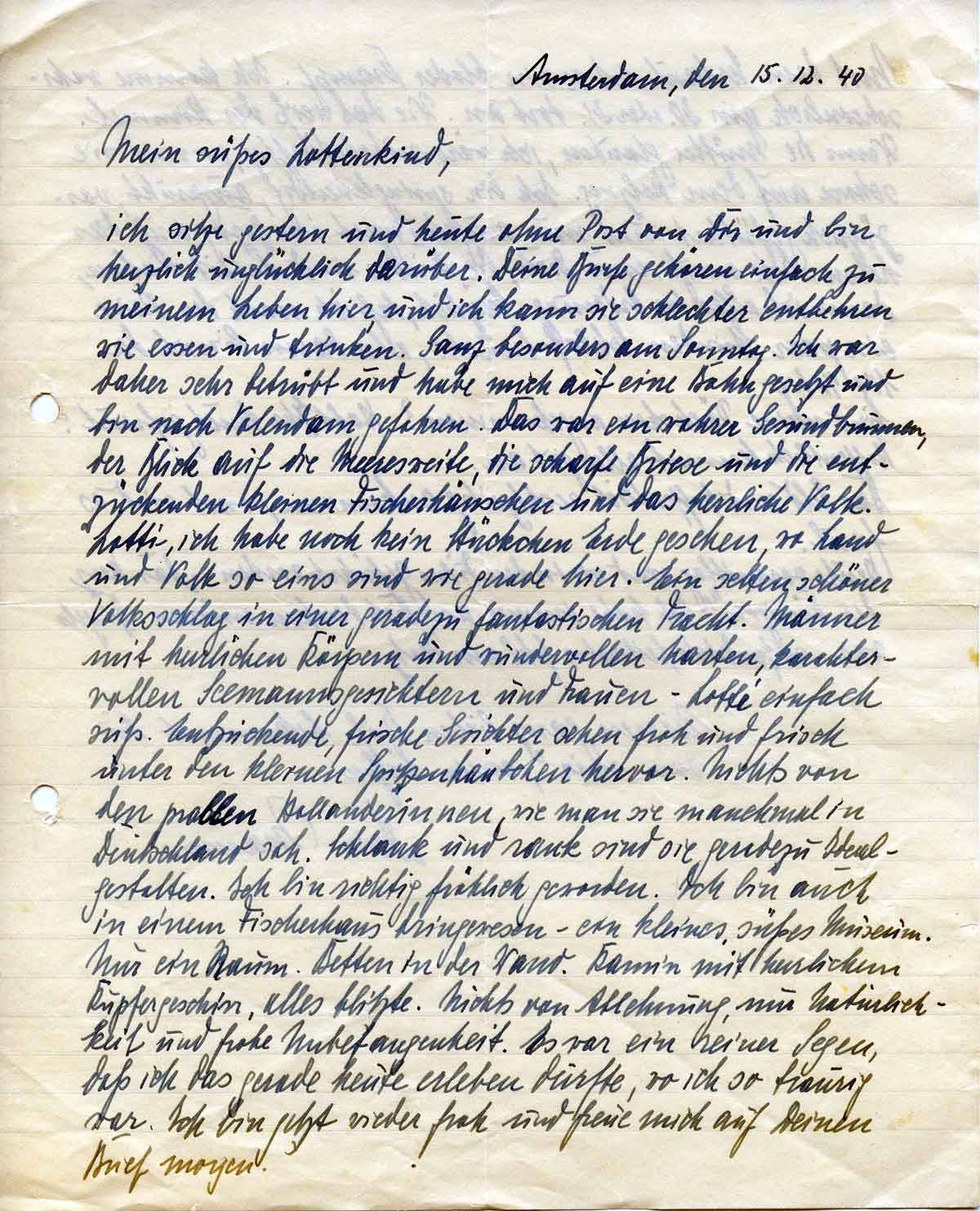 ich sitze gestern und heute ohne Post von Dir und bin herzlich unglücklich darüber. Deine Briefe gehören einfach zu meinem Leben hier und ich kann sie schlechter entbehren wie essen und trinken. Ganz besonders am Sonntag. Ich war daher sehr betrübt und habe mich auf eine Bahn gesetzt und bin nach Valendam gefahren. Das war ein wahrer Gesundbrunnen, der Blick auf die Meeresseite, die scharfe Briese (!) Und die entzückenden kleinen Fischerhäuschen und das herzlichen Volk. Lotti, ich habe noch kein Stückchen Erde gesehen, wo Land und Volk so eins sind wie gerade hier. Ein selten schöner Volksschlag in einer geradezu fantastischen Tracht. Männer mit herrlichen Körpern und wundervollen, harten, charaktervollen Seemannsgesichtern und Frauen – Lotti einfach süß. Entzückende, frische Gesichter sehen froh und frisch unter den kleinen Spitzenhäubchen hervor. Nichts von den prallen Holländerinnen, wie man sie manchmal in Deutschland sah. Schlank und rank sind sie geradezu Idealgestalten. Ich bin richtig fröhlich geworden. Ich bin auch in einem Fischerhaus dringewesen – ein kleines, süßes Museum. Nur ein Raum. Betten in der Wand. Kamin mit herrlichem Kupfergeschirr, alles blitzte. Nicht von Ablehnung, nur Natürlichkeit und frohe Unbefangenheit. Es war ein reiner Segen, dass ich das gerade heute erleben durfte, wo ich so traurig war. Ich bin jetzt wieder froh und freue mich auf deinen Brief morgen.