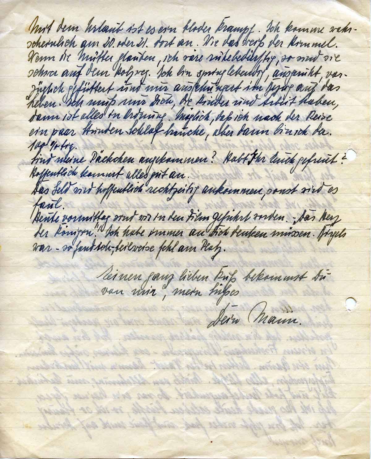 Mit dem Urlaub ist es ein blöder Krampf. Ich komme wahrscheinlich am 20. oder 21. dort an. Wie das weiß der Himmel. Wenn die Mütter glauben, ich wäre ruhebedürftig, so sind sie schwer auf dem Holzweg. Ich bin springlebendig, ausgeruht, vorzüglich gefüttert und nur ausgehungert im Bezug auf das Leben. Ich muss nur Dich, die Kinder und Arbeit haben, dann ist alles in Ordnung. Möglich, dass ich nach der Reise ein paar Stunden Schlaf brauche, dann bin ich da. 100 %ig.