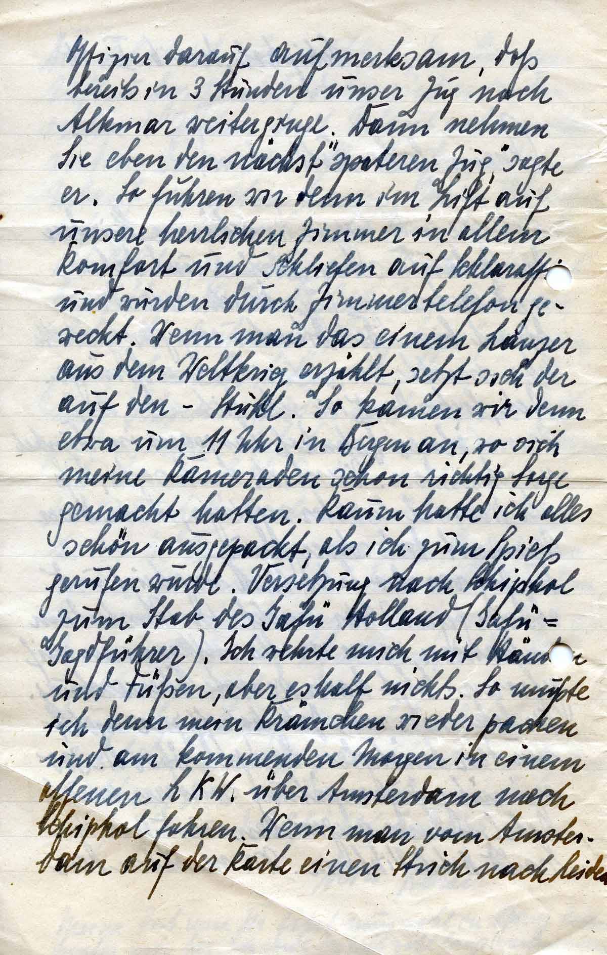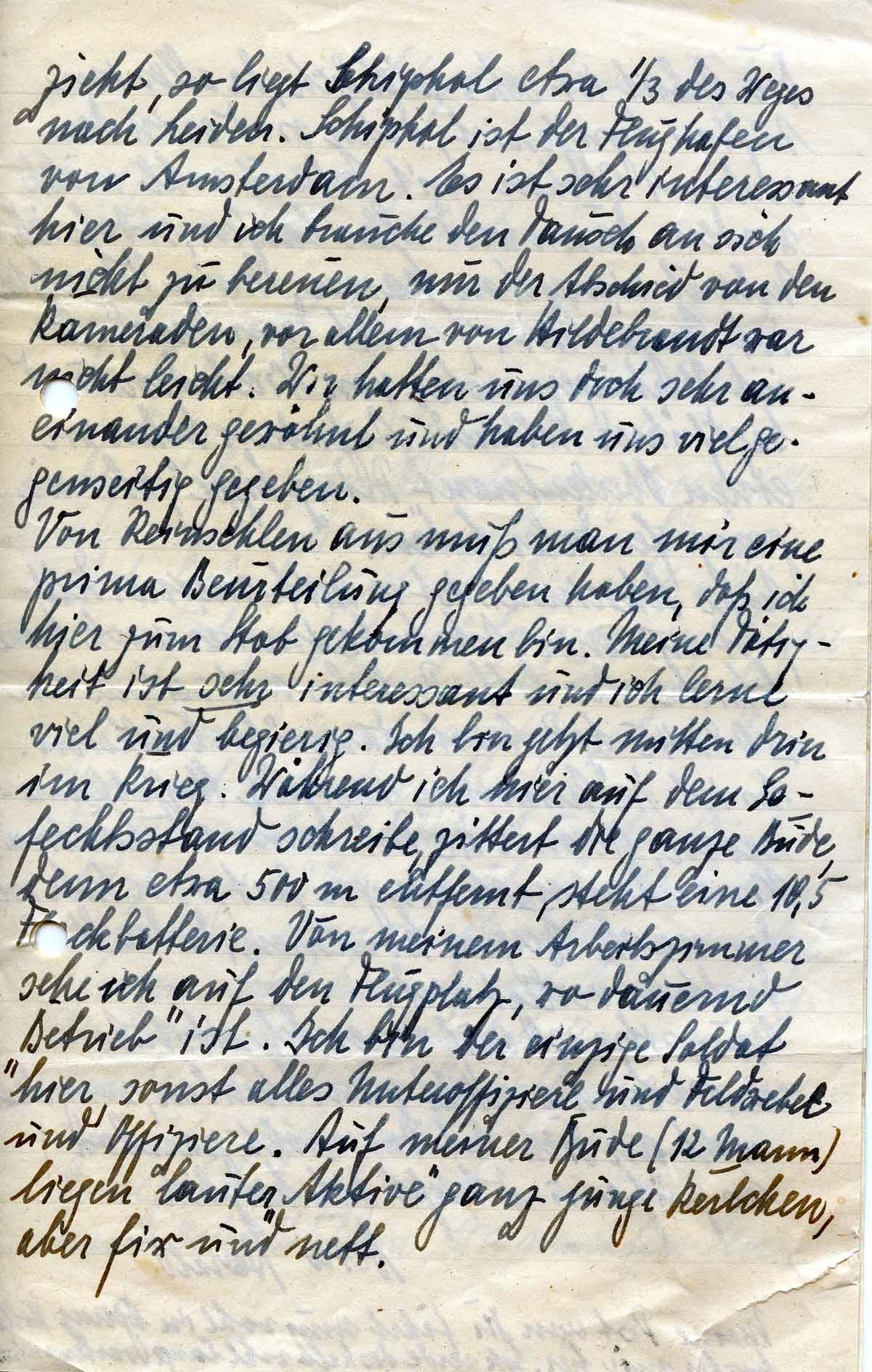 zieht, so liegt Schiphol etwa 1/3 des Weges nach Leiden. Schiphol ist der Flughafen von Amsterdam. Es ist sehr interessant hier und ich brauche den Tausch an sich nicht zu bereuen, nur der Abschied von den Kameraden, vor allem von Hildebrandt waren nicht leicht. Wir hatten uns doch sehr aneinander gewöhnt und haben uns viel gegenseitig gegeben.