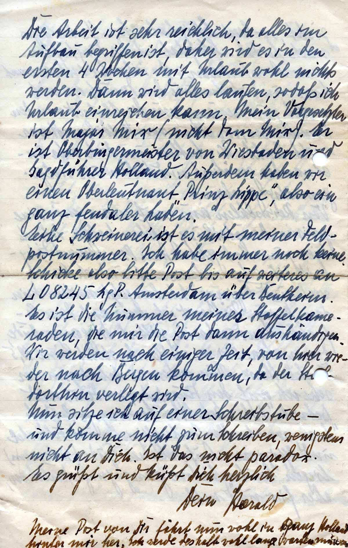 Eine Schweinerei ist es mit meiner Feldpostnummer. Ich habe noch immer keine. Schicke aber bitte Post bis auf weiteres an L 08245 Lg.P. Amsterdam über Bentheim. Es ist die Nummer meiner Staffelkameraden, die mir die Post dann aushändigen. Wir werden nach einiger Zeit, von hier wieder nach Bergen kommen, da der Stab dorthin verlegt wird.