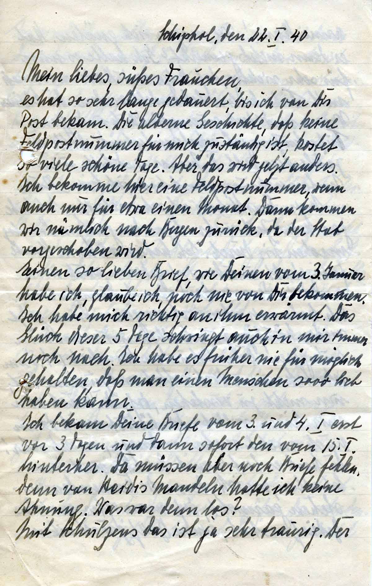 Mein Dienst hier ist sehr vielseitig. Ich habe da keine Zeit mehr. Sogar den ganzen Sonntag machen wir durch. Ich habe noch keine Stunde frei gehabt und bin infolgedessen auch noch nicht in dem nahen Amsterdam gewesen. Ich habe mir aber doch vorgenommen jetzt wieder häufiger zu schreiben und wenn es in ruhigeren Dienststunden (unleserlich), denn ich bekomme doch selbst viel zu gerne Post, um nicht zu verstehen, dass Du auch von mir hören willst. Du hälst (!) mich dann auch nicht mehr so knapp, nicht wahr? Du hast es bestimmt leichter mit dem Schreiben wie ich, denn die Kameraden verstehen garnicht, dass man öfter mal das Bedürfnis hat, einen Brief zu schreiben.