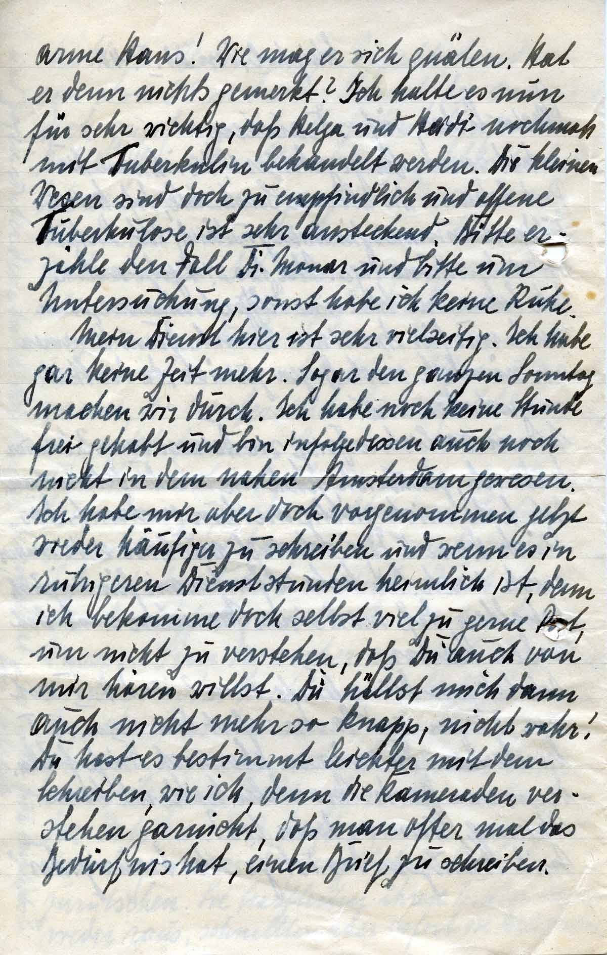 arme Hans! Wie mag er sich quälen. Hat er denn (von seiner offenen Tb) nichts gemerkt? Ich halte es nun für sehr wichtig, dass Helga und Heidi nochmals mit Tuberkulin behandelt werden. Die kleinen Wesen sind doch sehr empfindlich und offene Tuberkulose ist sehr ansteckend. Bitte erzähle den Fall Dr. Monar (=dem Kinderarzt) und bitte um Untersuchung, sonst habe ich keine Ruhe.