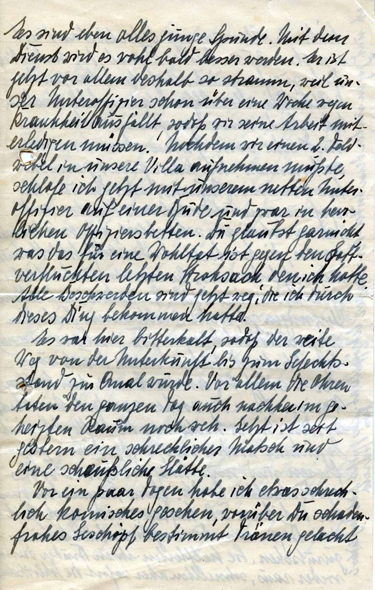 Es sind eben alles junge Stunde. Mit dem Dienst wird es wohl bald besser werden. Er ist jetzt vor allem deshalb so stramm, weil unser Unteroffizier schon über eine Woche wegen Krankheit ausfällt, sodass wir seine Arbeit miterledigen müssen. Nachdem wir einen 2. Feldwebel in unsere Villa aufnehmen musste(n) , schlafe ich jetzt mit unserem netten Unteroffizier auf einer Bude und zwar in herrlichen Offiziersbetten. Du glaubst garnicht was das für eine Wohltat ist gegen den Gottverfluchten letzten Strohsack, den ich hatte. Alle Beschwerden sind jetzt weg, die ich durch dieses Ding bekommen hatte.