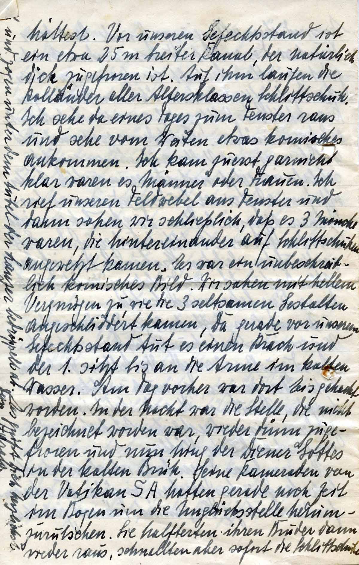 hättest. Vor unserem Gefechtsstand ist ein etwa 25 m breiter Kanal, der natürlich dick zugefroren ist. Auf ihm laufen die Holländer aller Altersklassen Schlittschuh. Ich sehe eines Tages zum Fenster raus und sehe vom Weiten etwas komisches ankommen. Ich kam zuerst garnicht klar waren es Männer oder Frauen. Ich rief unseren Feldwebel ans Fenster und dann sahen wir schließlich, dass es 3 Mönche waren, die hintereinander auf Schlittschuhen angewetzt kamen. Es war ein unbeschreiblich komisches Bild. Wir sahen mit hellem Vergnügen zu, wie die 3 seltsamen Gestalten angeschlittert kamen. Da, gerade vor unserem Gefechtsstand tut es einen Krach und der 1. sitzt bis an die Arme im kalten Wasser. Am Tag vorher war dort Eis gehackt worden. In der Nacht war die Stelle, die nicht bezeichnet worden war, wieder dünn zugefroren und nun hing der Diener Gotte in der kalten Brühe. Seine Kameraden von der VatikanSA hatten gerade noch Zeit im Bogen um die Unglücksstelle herumzurutschen. Sie halfterten ihren Bruder dann wieder raus, schnallten aber sofort die Schlittschuhe und zogen unter dem Jubel der Lanzer(!) bedröppelt ab. Es grüßt dich herzlichst