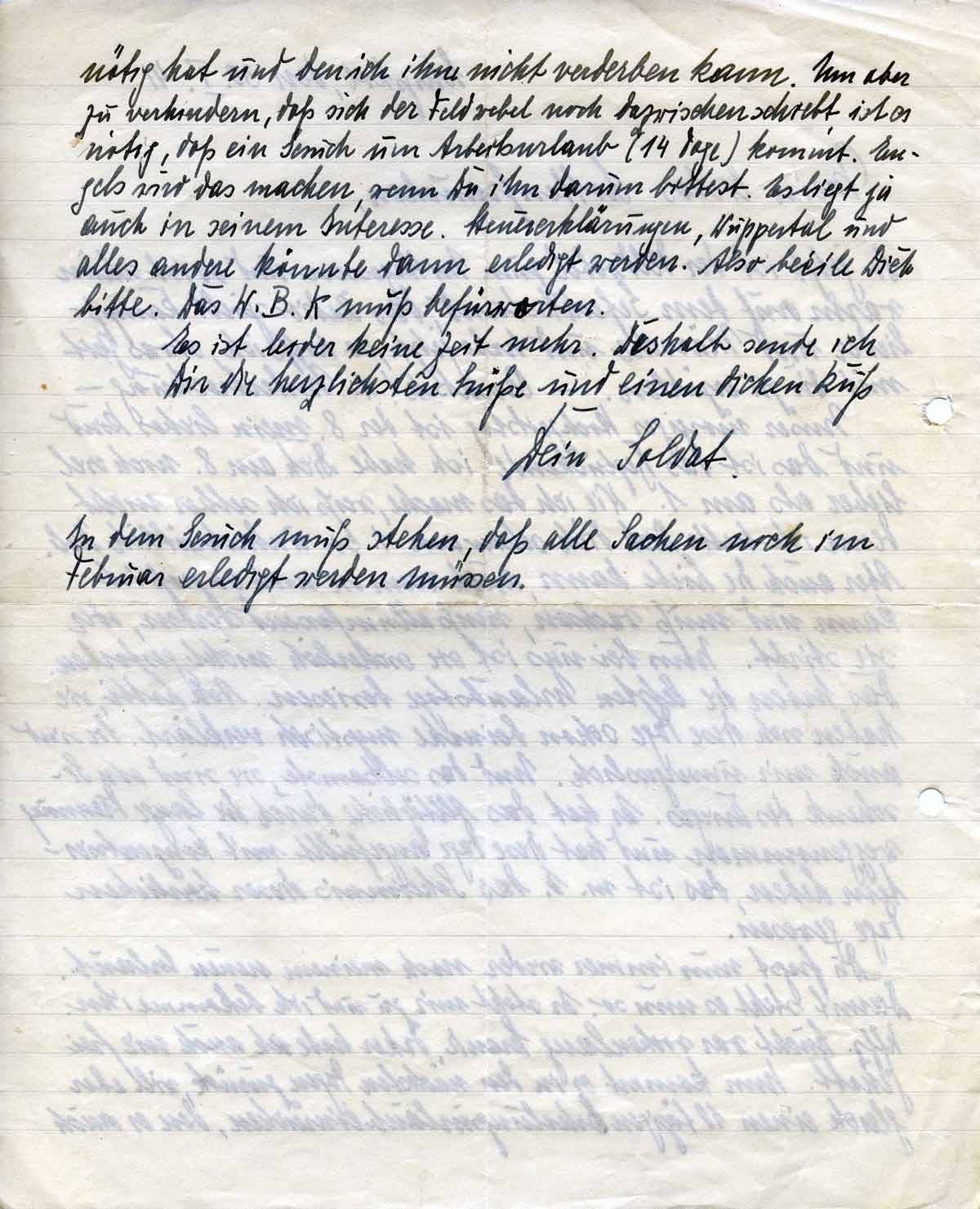 unser morgiger Hochzeitstag ist der 8. , mein liebes Kind und das ist das Beglückende, ich habe dich am 8. noch viel lieber als am 1. Wie ich das mache, weiß ich selber nicht, denn ich hatte Dich schon am 1. unwahrscheinlich lieb. Aber auch die Liebe kann, auch wenn sie noch so groß ist kann und muss wachsen, muss allumfassend werden, oder sie stirbt. Nun bei uns ist sie sicherlich nicht gestorben. Das haben die letzten Urlaubstage bewiesen. Ach Lotti, wie haben sich diese Tage schon beinahe mystisch verklärt. Sie sind auch mir unvergesslich. Und das seltsamste, sie sind ein Geschenk des Krieges. Er hat das Alltägliche durch die lange Trennung weggenommen und hat diese Tage angefüllt mit konzentriertem Leben, das ist m. E. Das Geheimnis dieser herrlichen Tage gewesen.