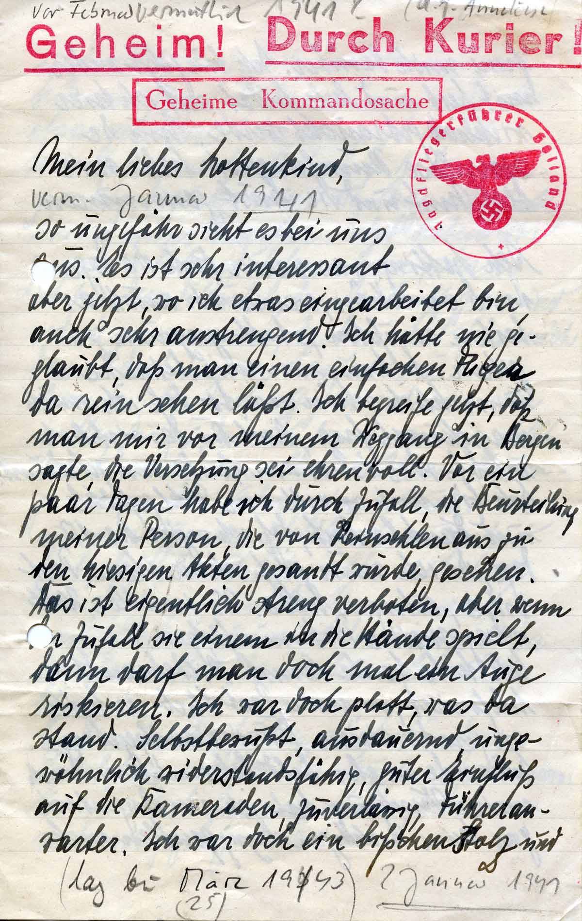 Meine Post schicke bitte wieder an meine alte Feldpostnummer L 14401 Lg.P.A. Amsterdam über Bentheim aber an Soldat E. Hildebrand adressiert. Der Weg über Hildebrandt und Kurier ist mir doch sicherer.